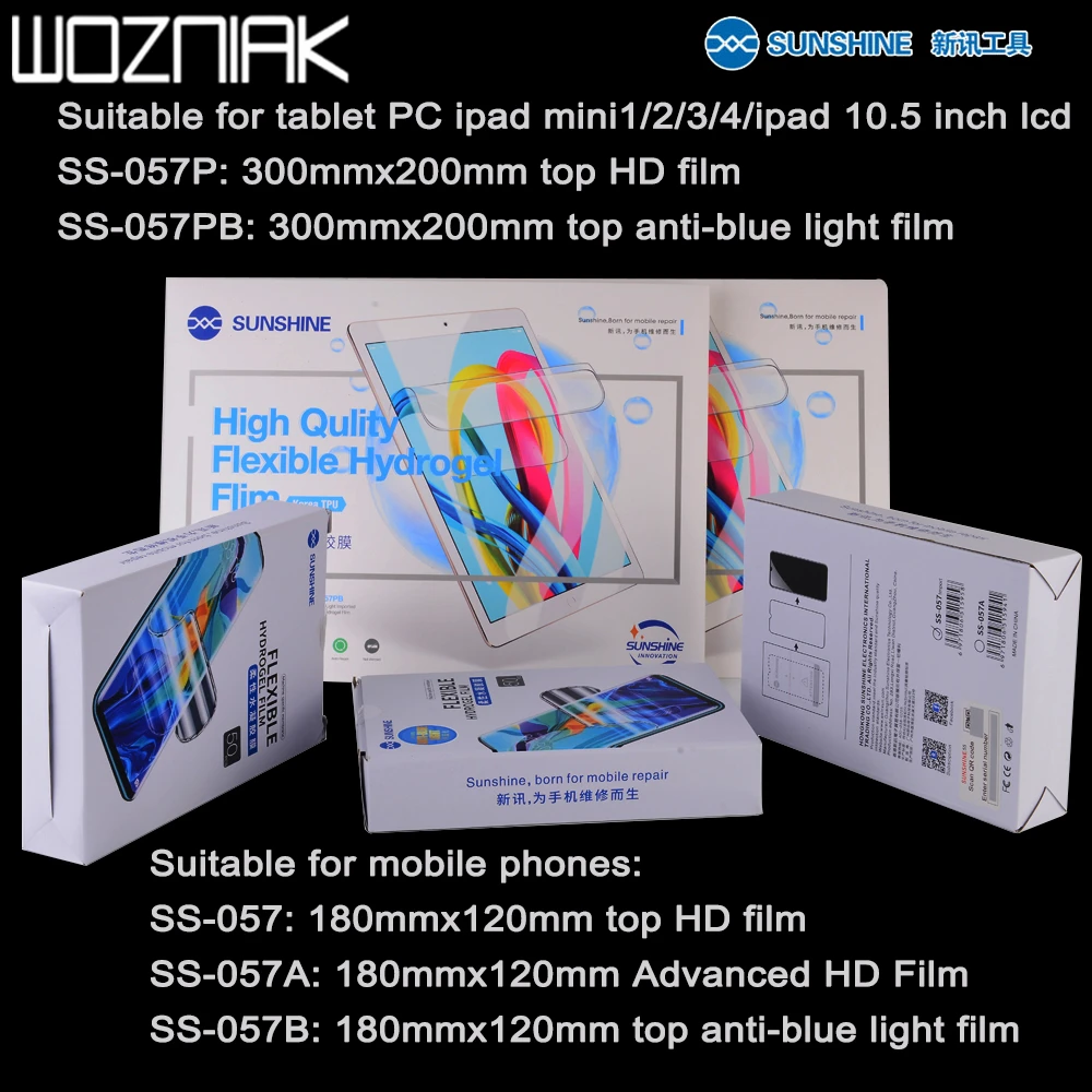 SS-057H: 180 мм x 120 ммSS-057: 180 мм x 120 ммSS-057A: 180 мм x 120 мм усовершенствованная hd-пленкаSS-057B: 180 мм x 120 мм Верхний анти-синий светильникSS-057E: 180 мм x 120 ммМатовыйПленкаSS-057R: 180 мм x 120 мм профессиональная изогнутая экранная пленкаПодходит для планшетных ПК ipad mini1/2/3/4/ipad 10,5 дюймов lcdSS-057P: 300 мм x 200 ммSS-057PB: 300 мм x 200 мм Верхний анти-синий светильник