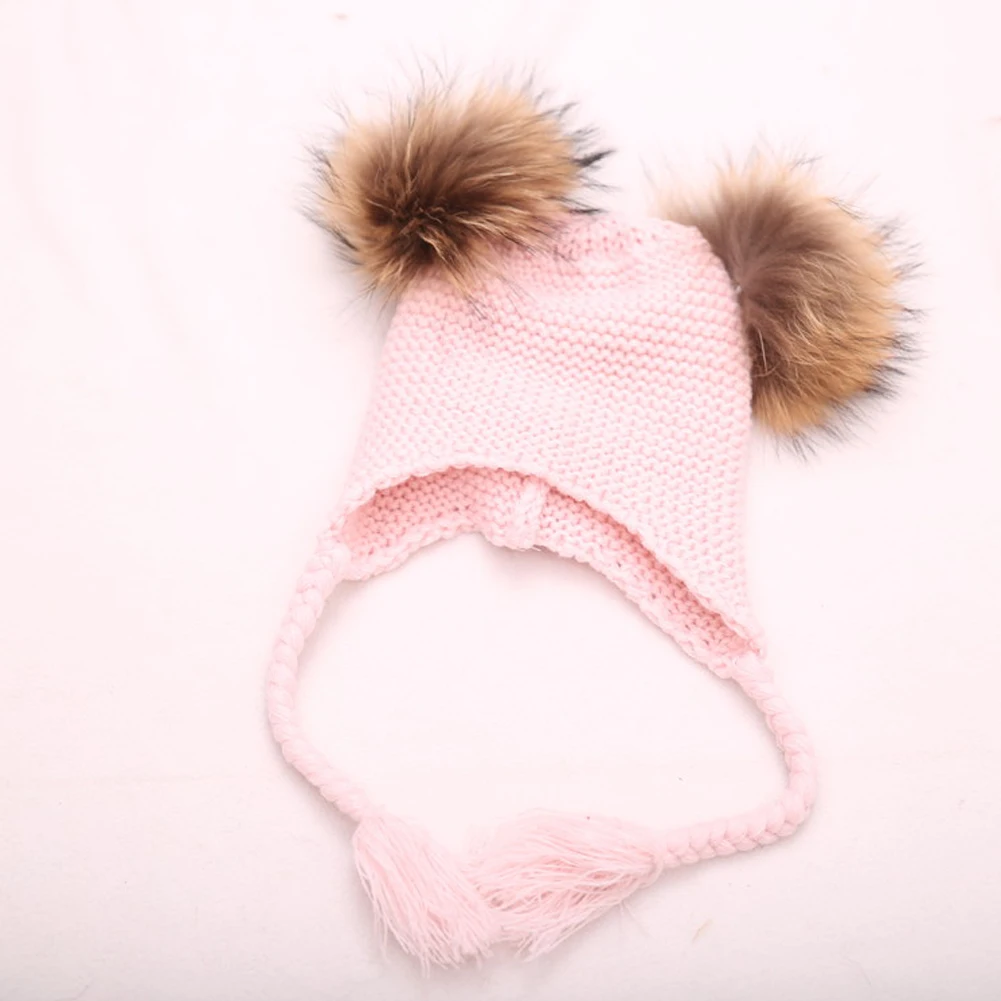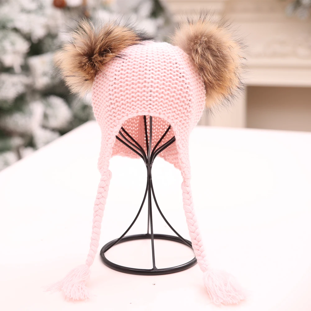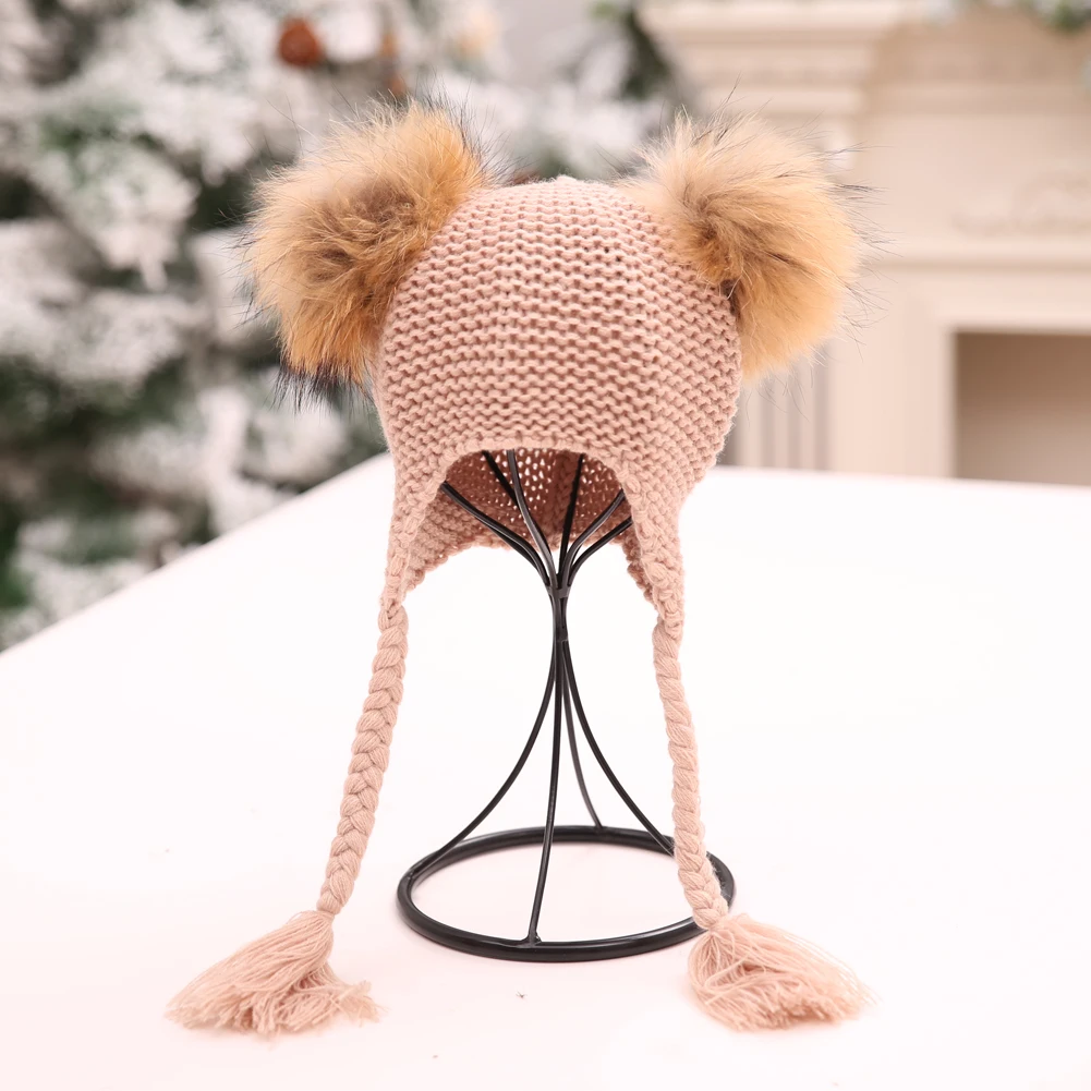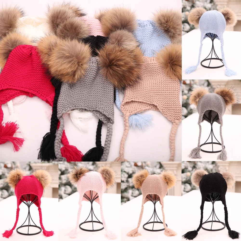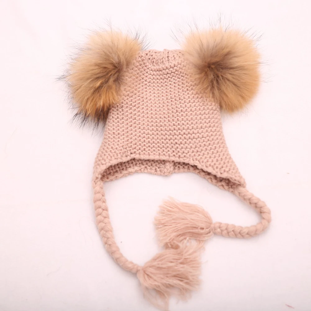 Детская зимняя теплая шапка с двойным мехом ребенок Мальчики для девочек, вязаная шапка, шапка, с помпоном-кисточкой