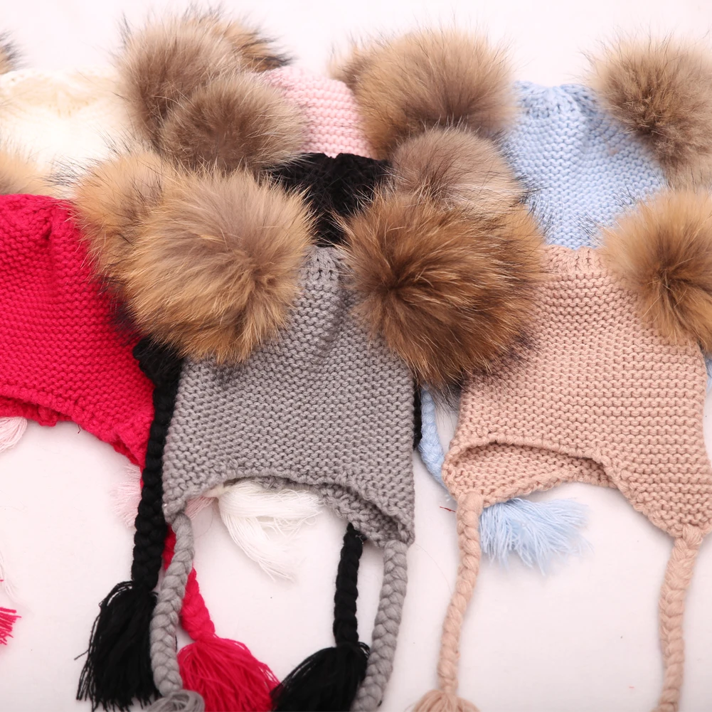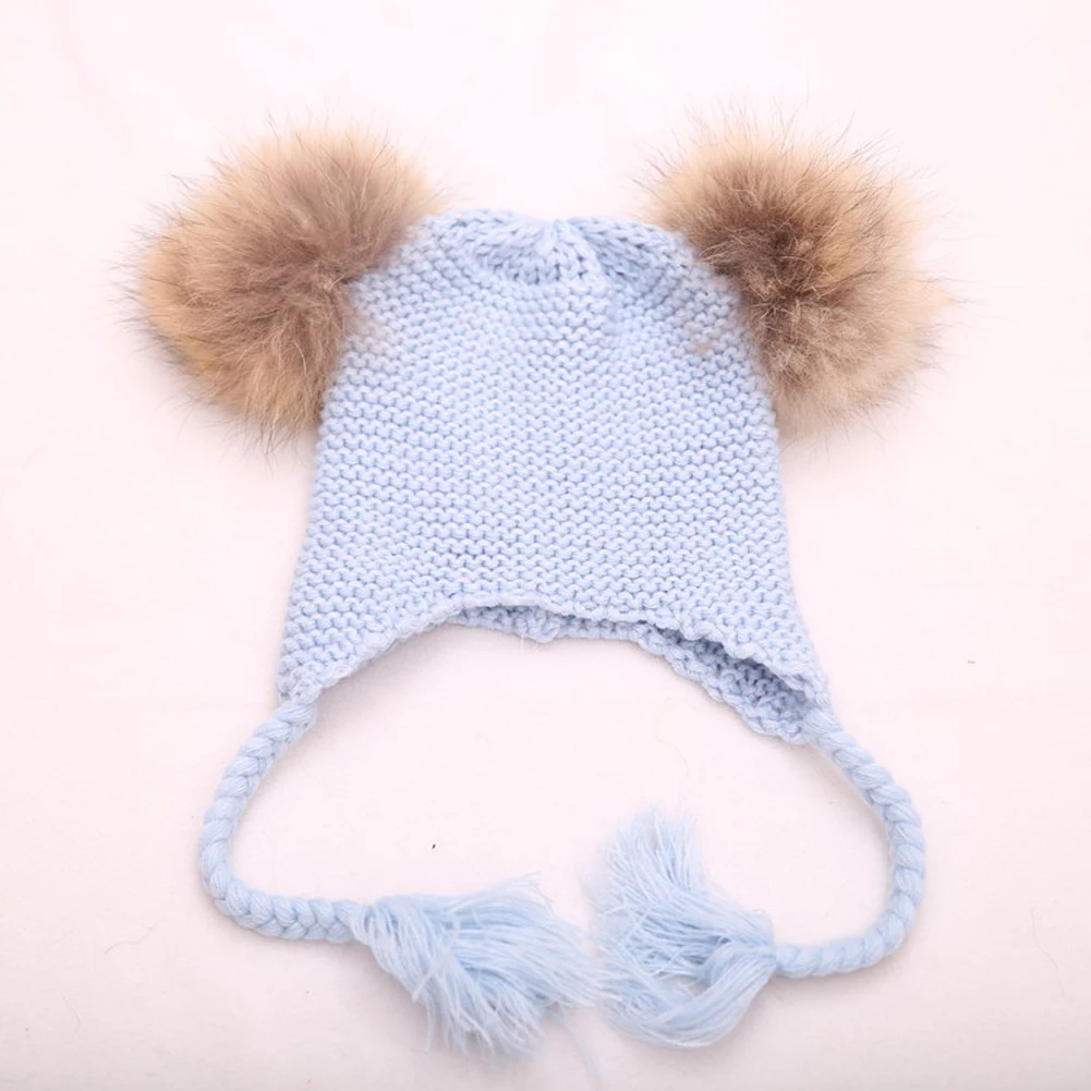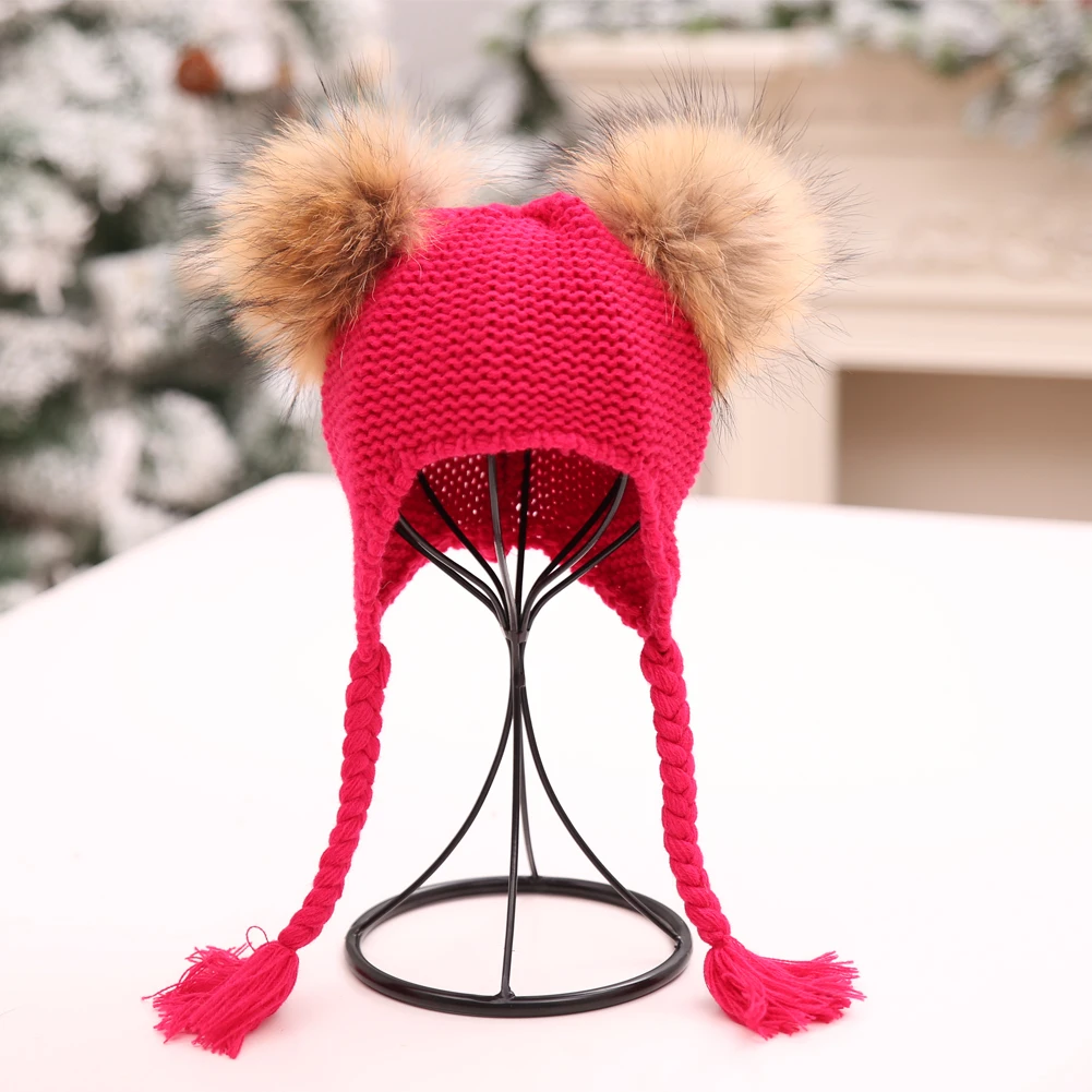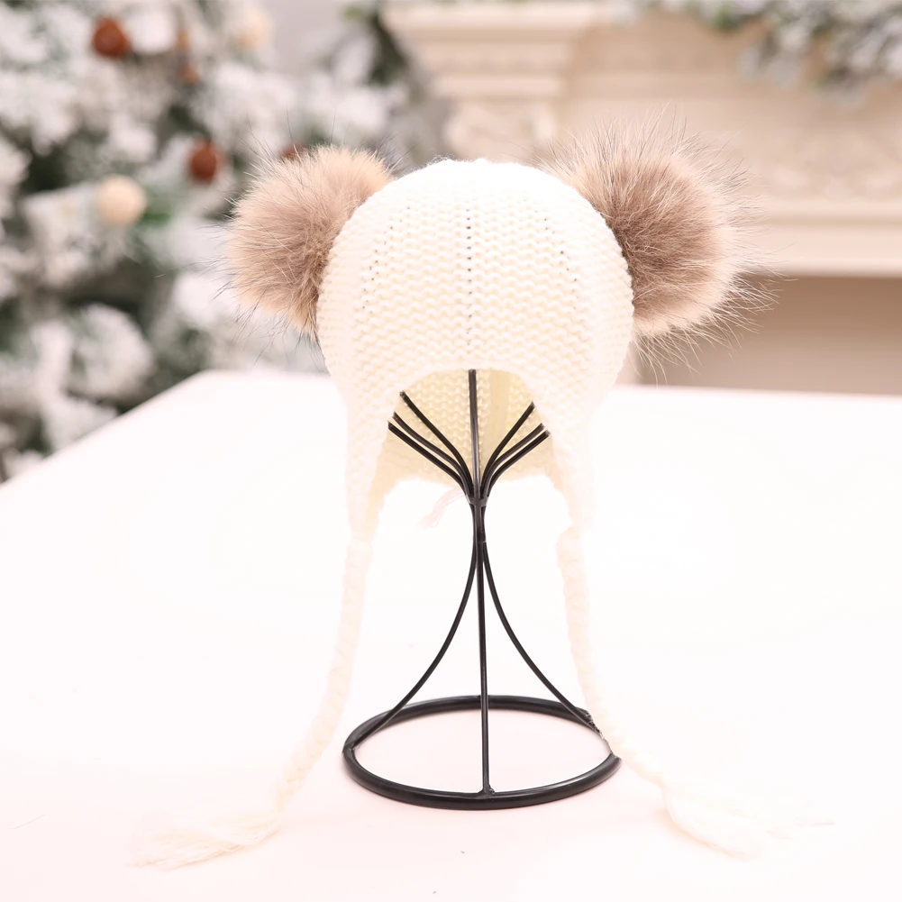 Детская зимняя теплая шапка с двойным мехом ребенок Мальчики для девочек, вязаная шапка, шапка, с помпоном-кисточкой