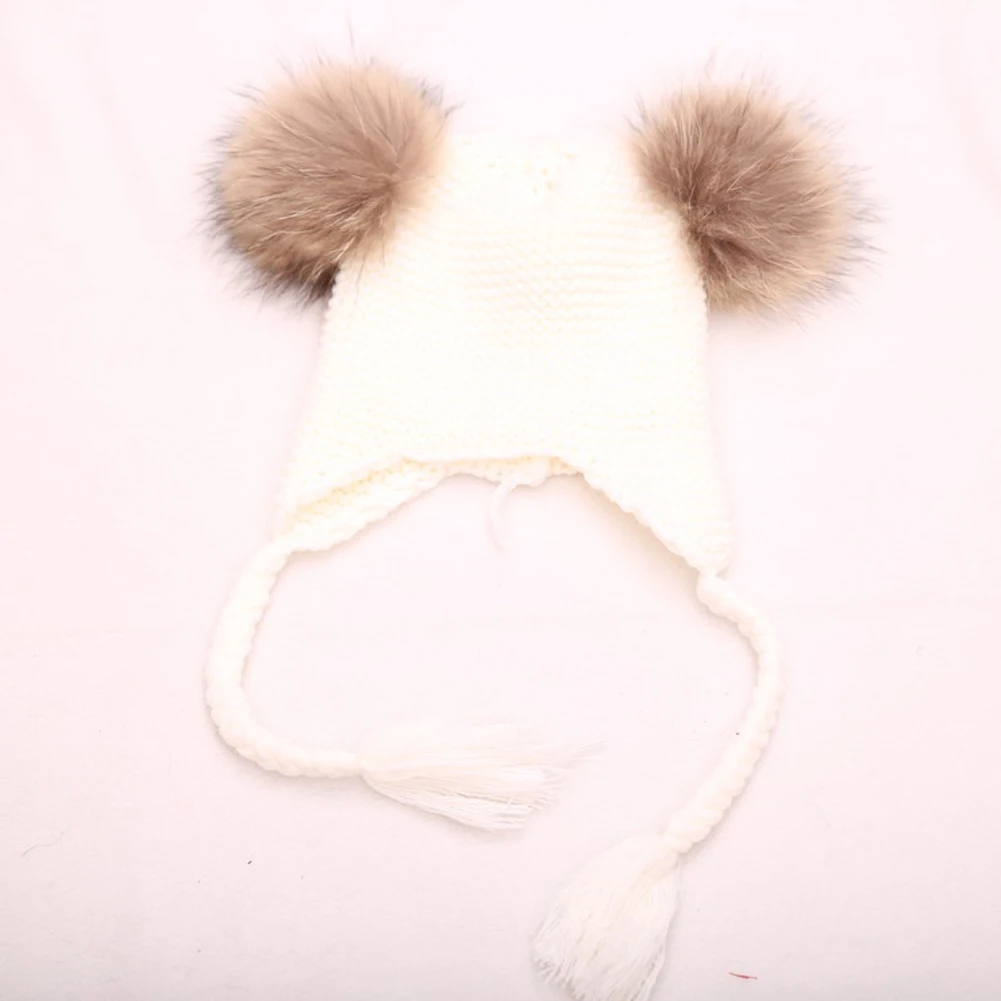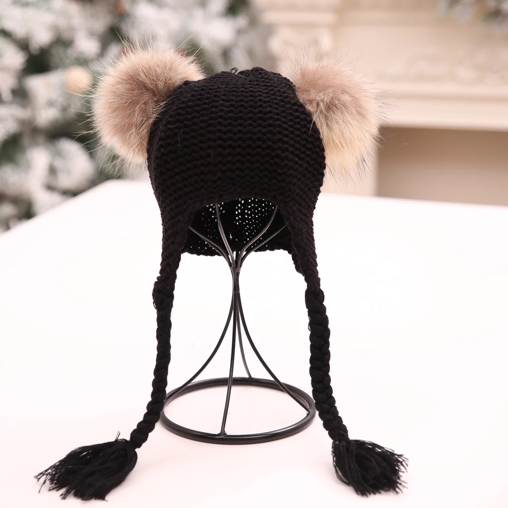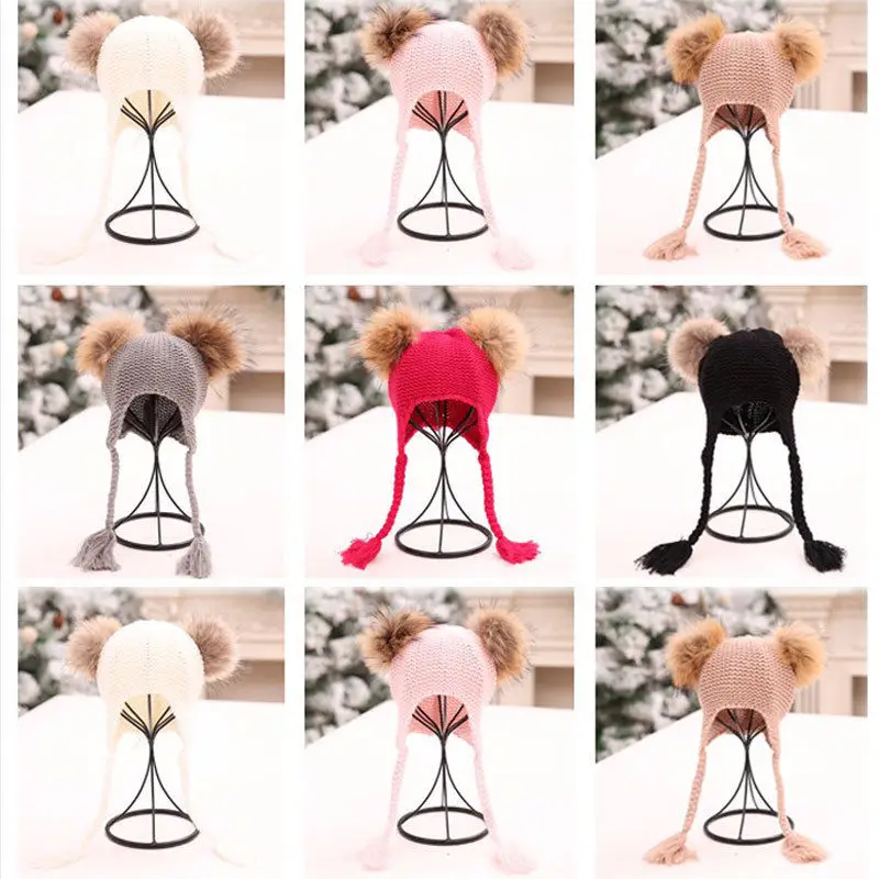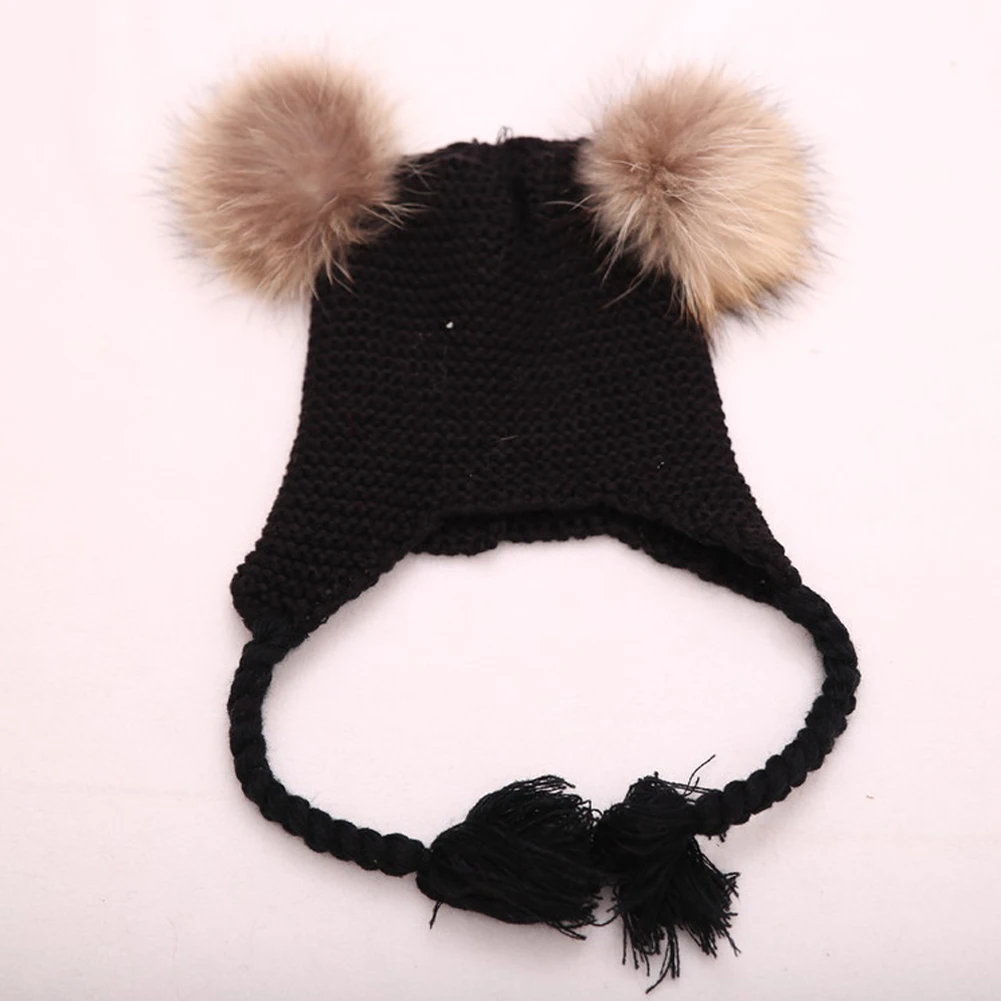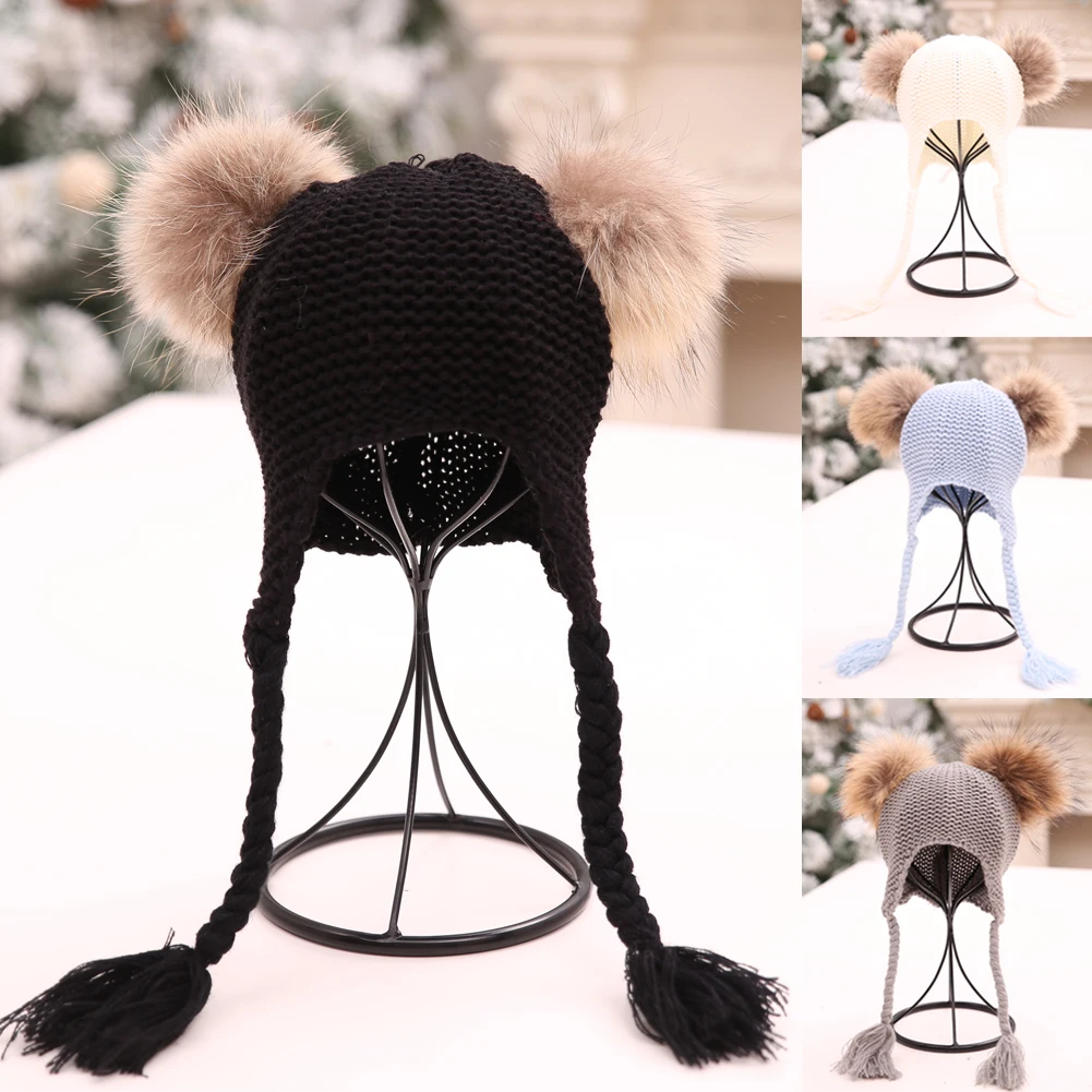 Детская зимняя теплая шапка с двойным мехом ребенок Мальчики для девочек, вязаная шапка, шапка, с помпоном-кисточкой