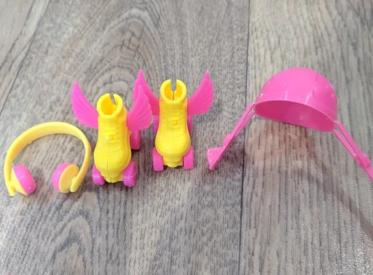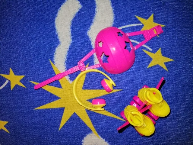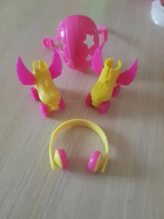 комплект полностью соответствует фото продавца, за небольшим различием от фото, наушники розовые а на фото продавца жёлтые. очень хрупкий материал. попробую надеть какой-нибудь кукле. ролики раздваиваются и на одном из них отсутствует крепление спереди
