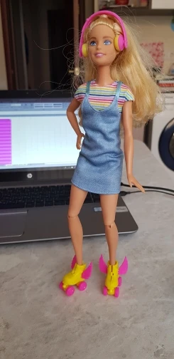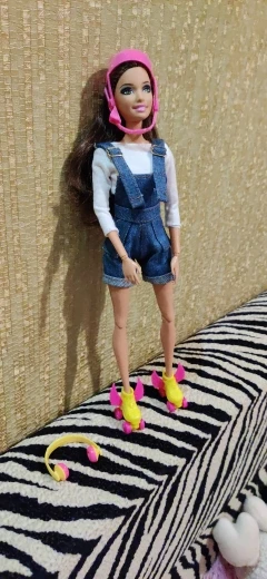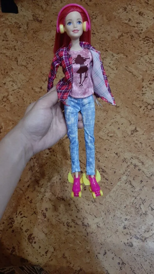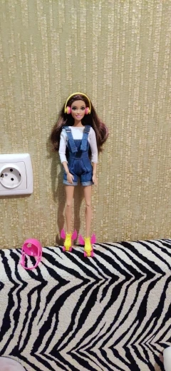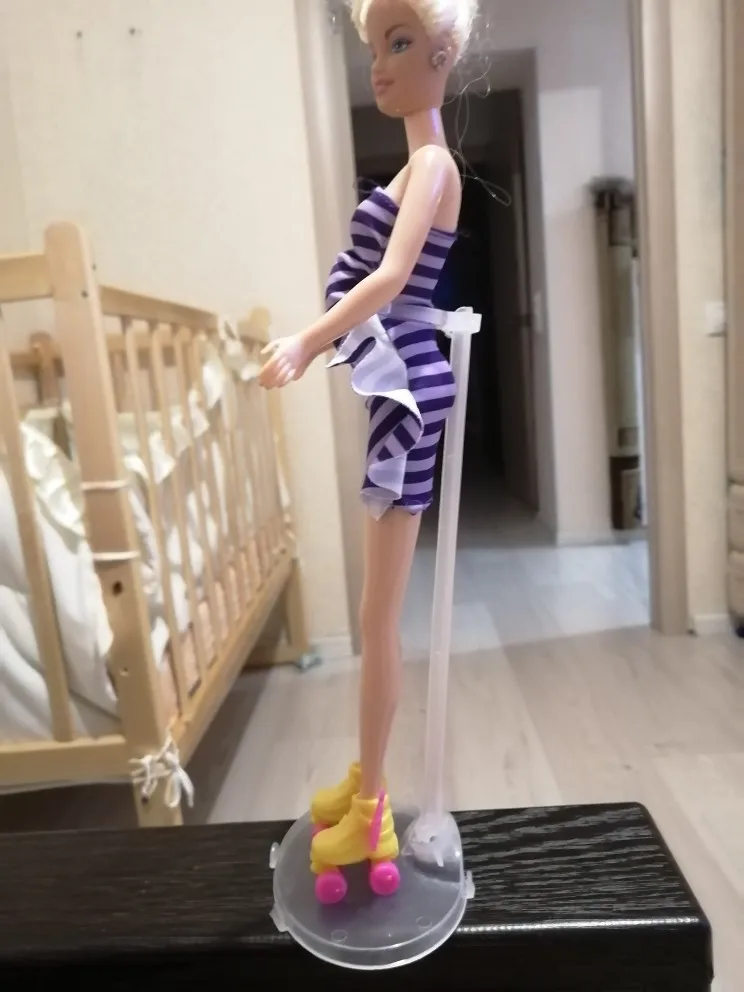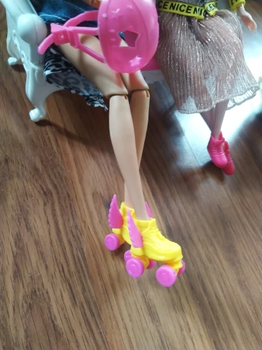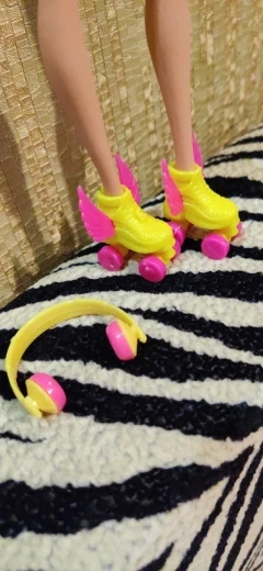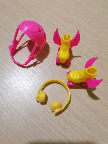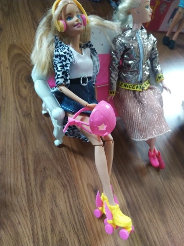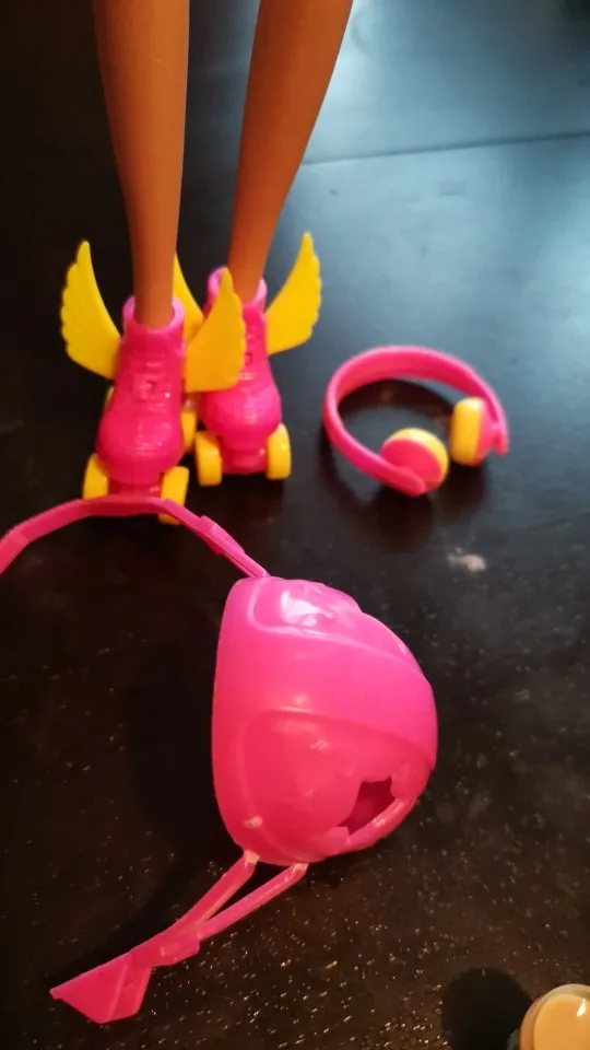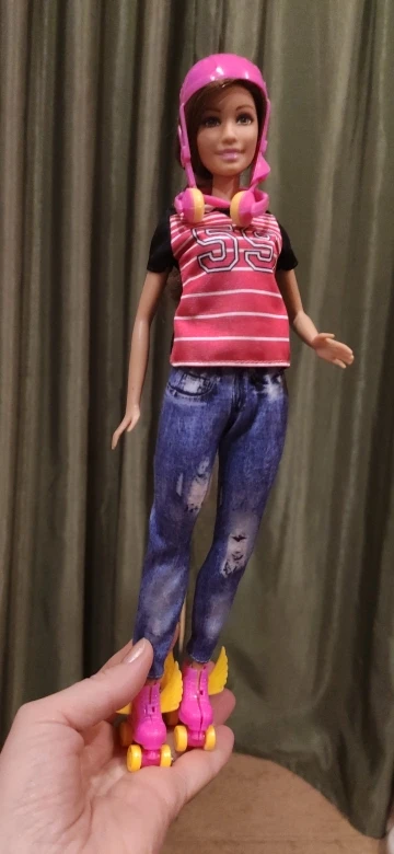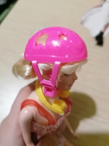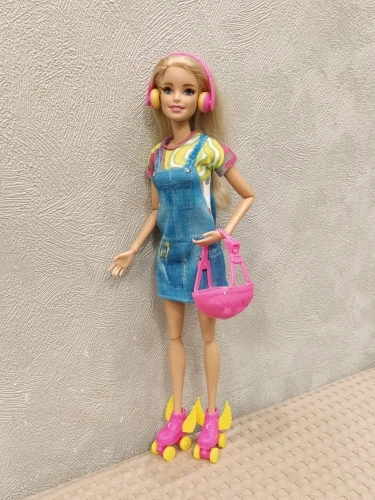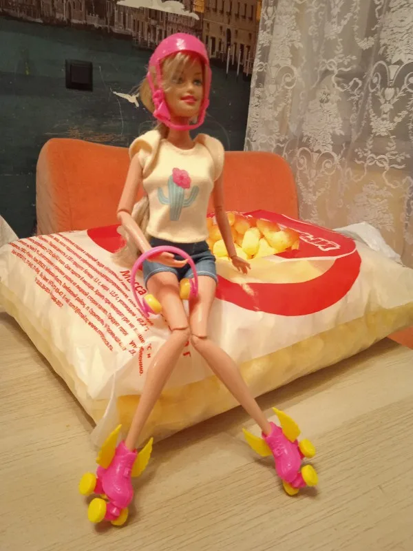 ну качество, конечно такое себе, но это и так видно)) Хотела жёлтые ролики и наушники, как у продавца на фото, а пришли стандартного барбейского розового) наушники норм, ролики на маленькую стопу Барби, пышке не налезли, они раздвигаются на две половинки, а так не засунешь. Шлем выглядит симпотно, но пластик конечно самый дешёвый, сразу становится белый на изломе, даже если слегка согибаешь, так что если для игр ребёнку брать- на пару раз) Ну мне на пофоткать хватит)