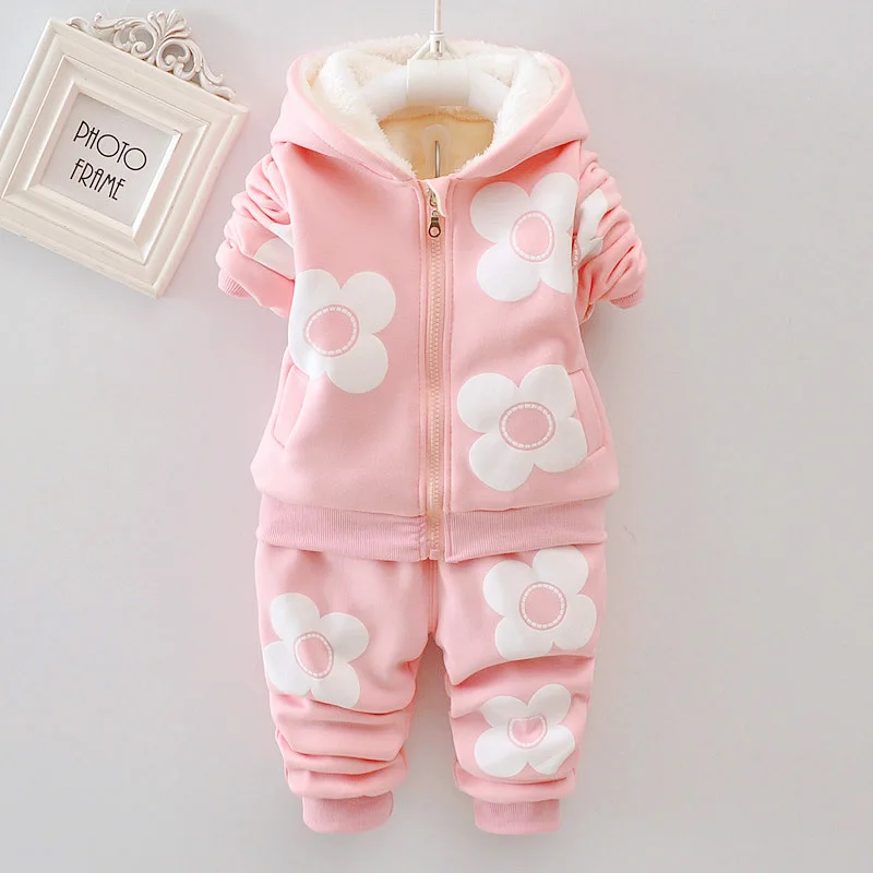 Комплект одежды с цветочным принтом для маленьких девочек, плотное теплое пальто с капюшоном и штаны, Осень-зима, От 1 до 4 лет
