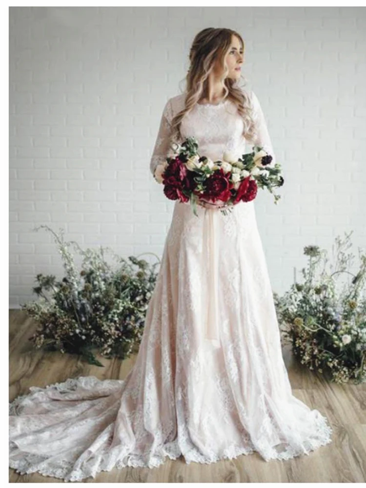 Скромное дизайнерское кружевное зимнее свадебное платье с подкладкой из шампгана, Длинные свадебные платья трапециевидной формы с длинными рукавами Boho vestido de noiva