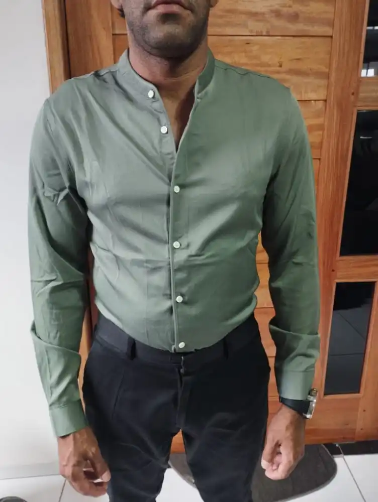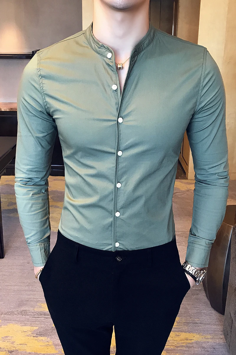 Китайская рубашка с воротником-стойкой, осенняя мужская хлопковая приталенная рубашка из бутика с длинными рукавами, Мужская классическая зеленая Повседневная деловая рубашка