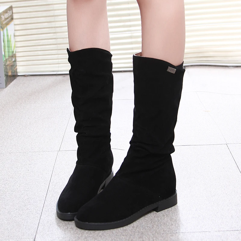 Женские ботинки; Сезон осень-зима; Матовые женские ботинки из флока; Женская обувь на низком каблуке, увеличивающая рост; Женские высокие сапоги до середины икры; Большие размеры 40