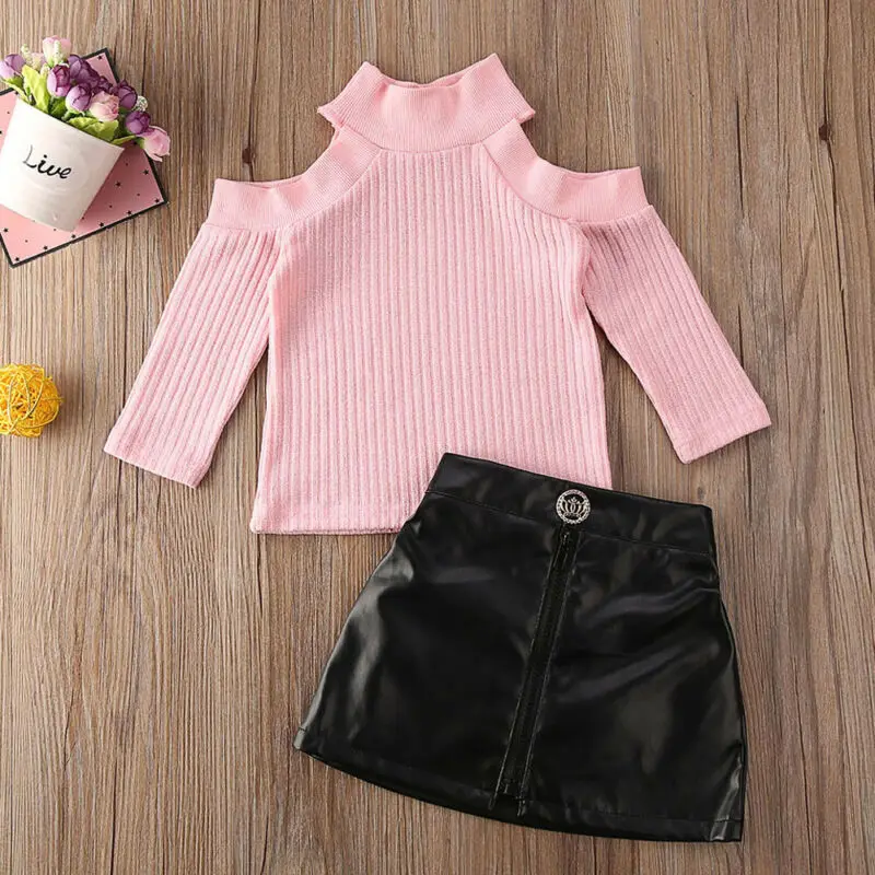 2 предмета, одежда для маленьких девочек Однотонный свитер с длинными рукавами и открытыми плечами Топы + мини-юбка из искусственной кожи осенняя одежда