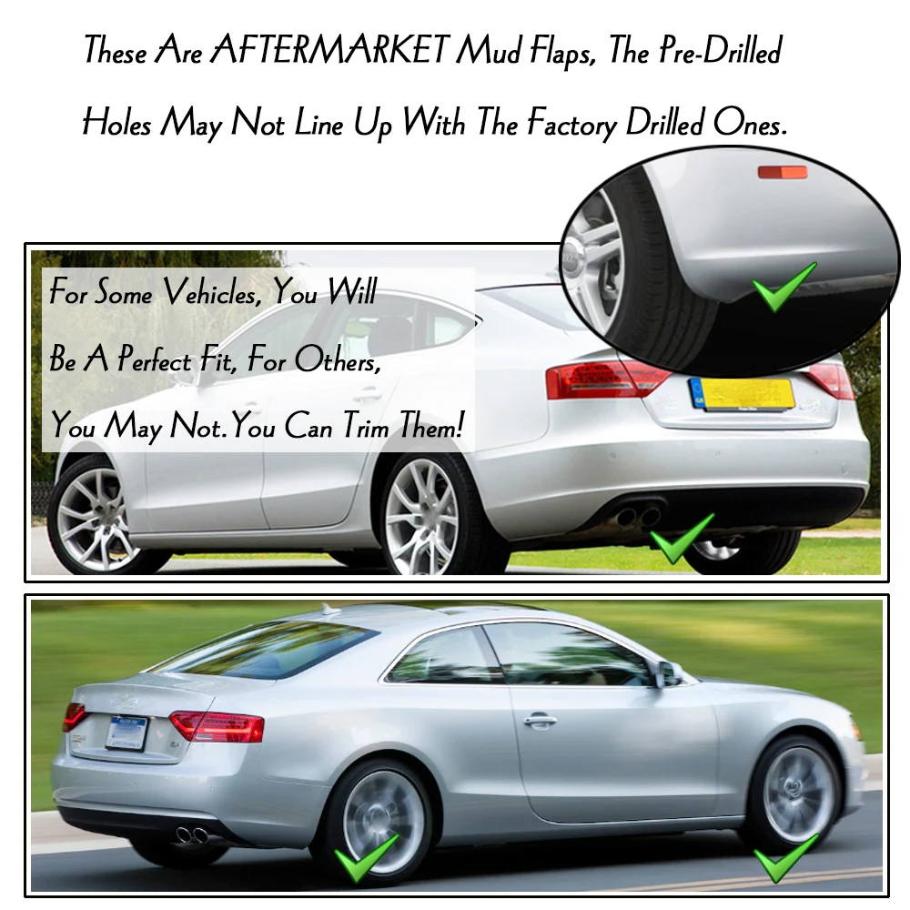 Примечание:Это универсальные брызговики, поэтому вы не можете быть идеальной посадкой на некоторых автомобилях, в противном случае вам может потребоваться обрезать их, чтобы соответствовать определённым транспортным средствам