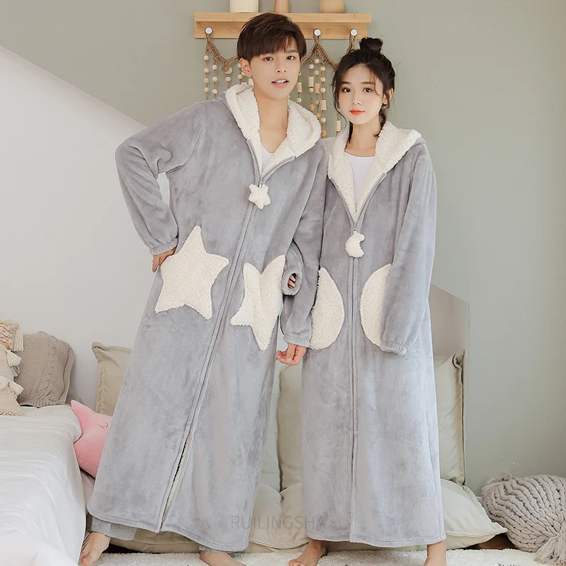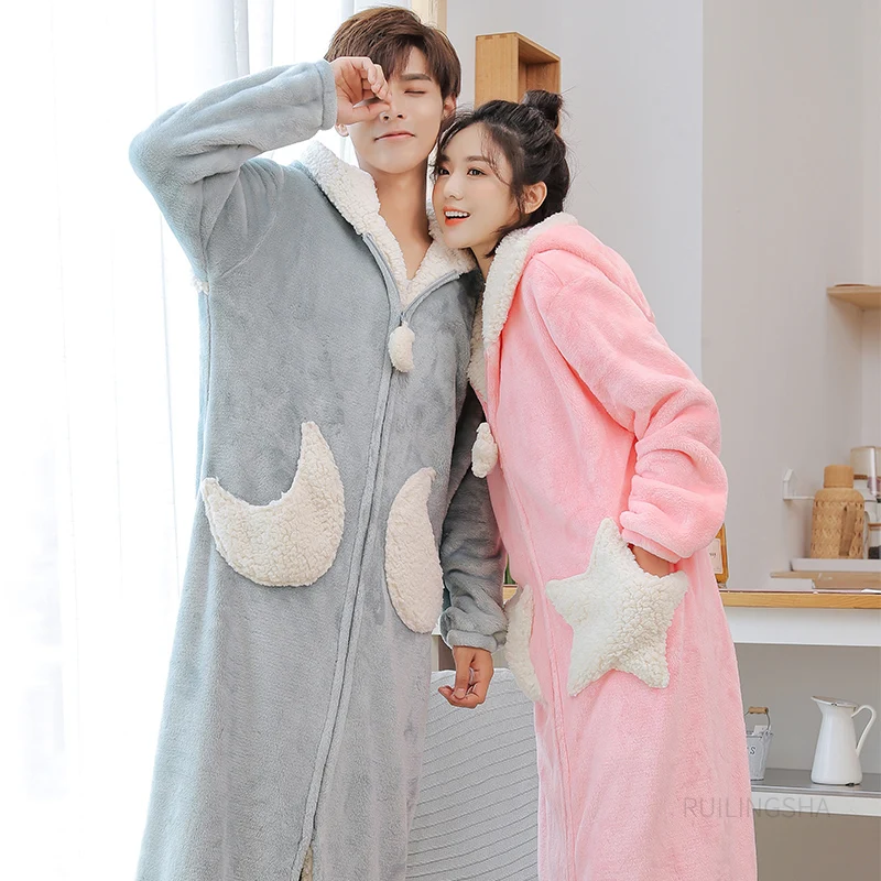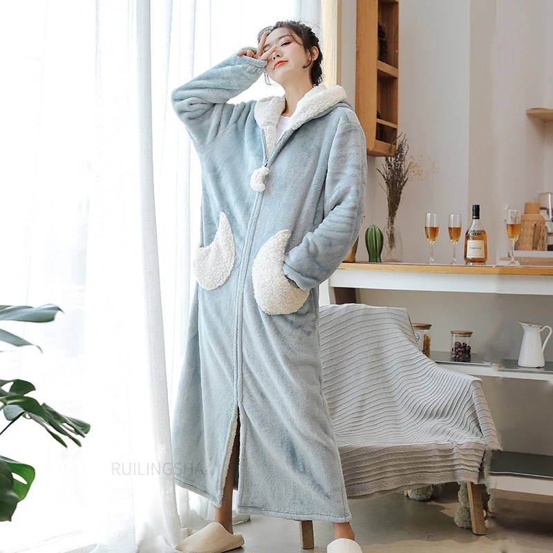 Женский зимний халат большого размера с милыми звездами, очень длинный теплый фланелевый Халат, фланелевый Халат на молнии для беременных, одежда для сна