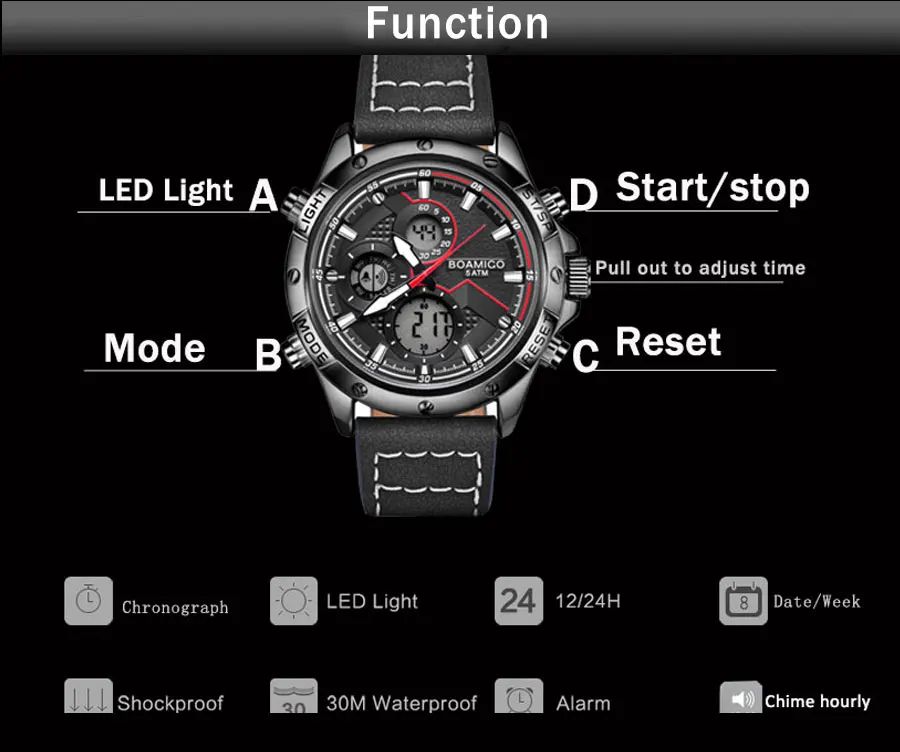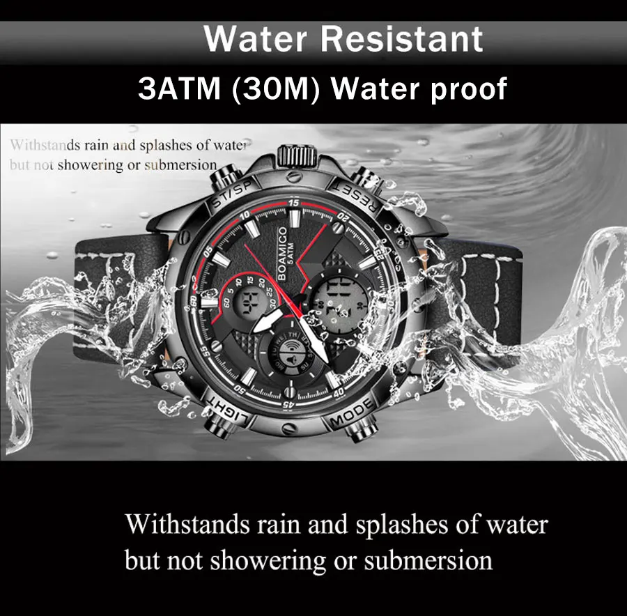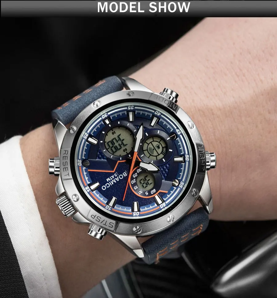 1. Функция: 2 часовых пояса, будильник, ежечасный сигнал, секундомеры, хронограф светодиодный светильник ка, дата, неделя, месяц 2. Идеально подходит для любых деловых, повседневных занятий спортом на открытом воздухе, занятий в помещении или повседневного использования, все маленькие циферблаты рабочие. 3. Механизм: аналоговый цифровой двойной дисплей, японский механизм 4. Материал ремешка: кожа 5. Водонепроницаемость 30 М: подходит для всех видов повседневного использования, таких как мытье рук, брызги. (Вы можете плавать с ним в холодной воде за короткое время, но не позволяйте нажимать клавиши под водой) 6. Показывает точное время 7. Хороший подарок на Рождество, Новый Год, день рождения и т. Д.
