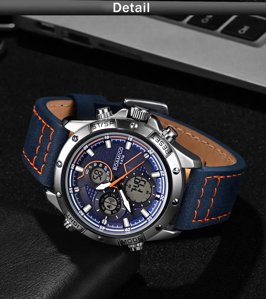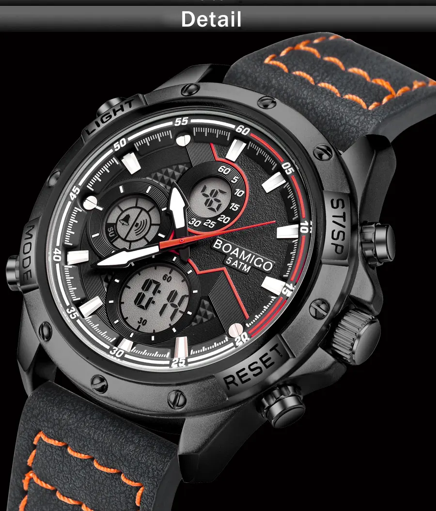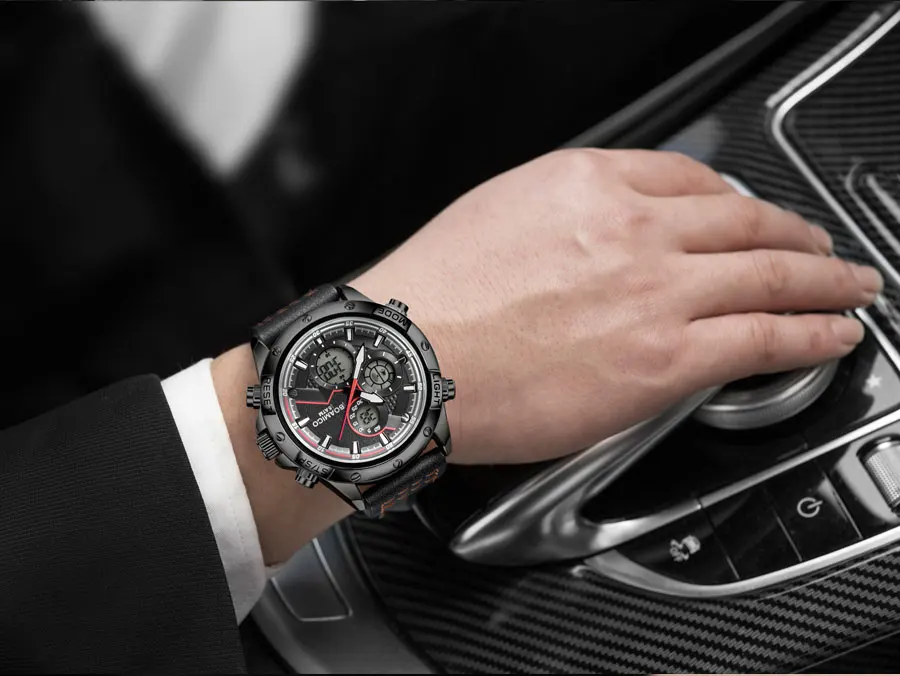 Часы мужские кварцевые с кожаным ремешком, цифровые и аналоговые часы, со светодиодной подсветкой
