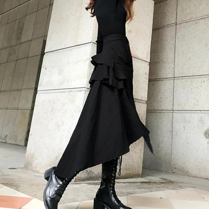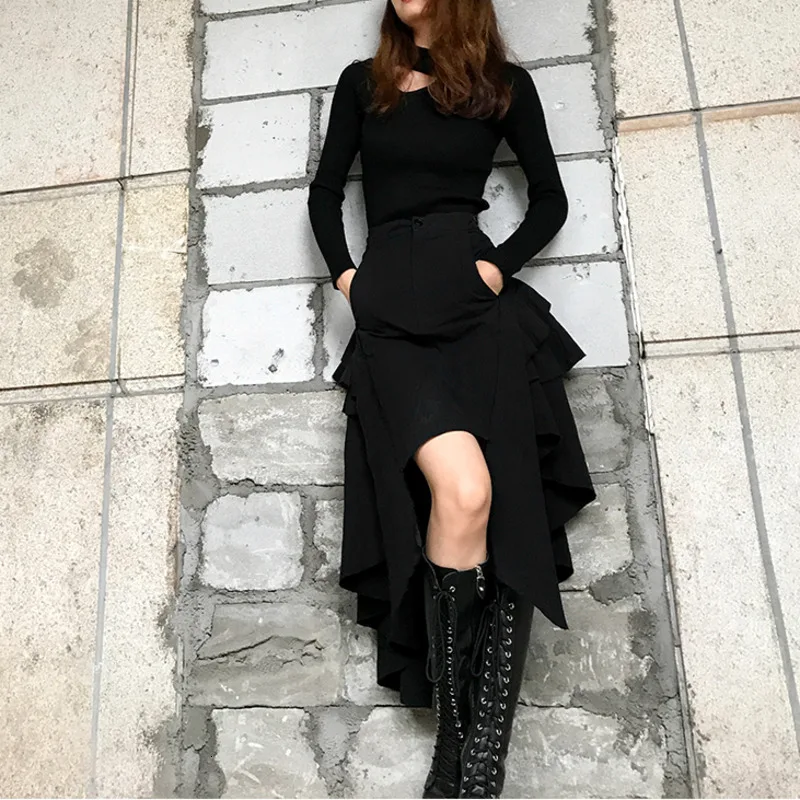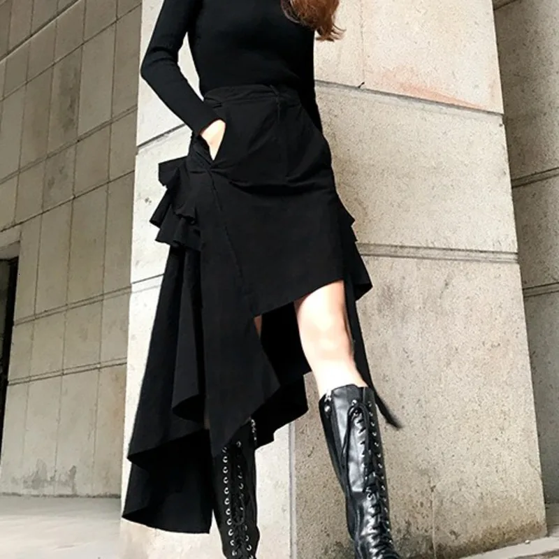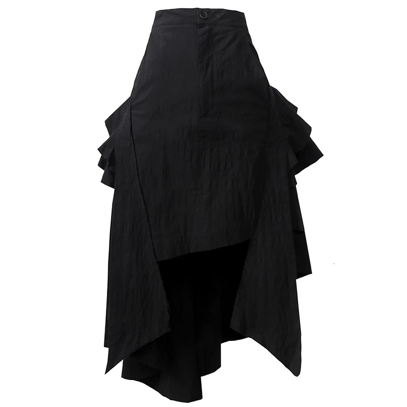 LANMREM 2021 новая весенняя и осенняя модная женская одежда с высокой талией Асимметричные оборки черная юбка средней длины WK20001L