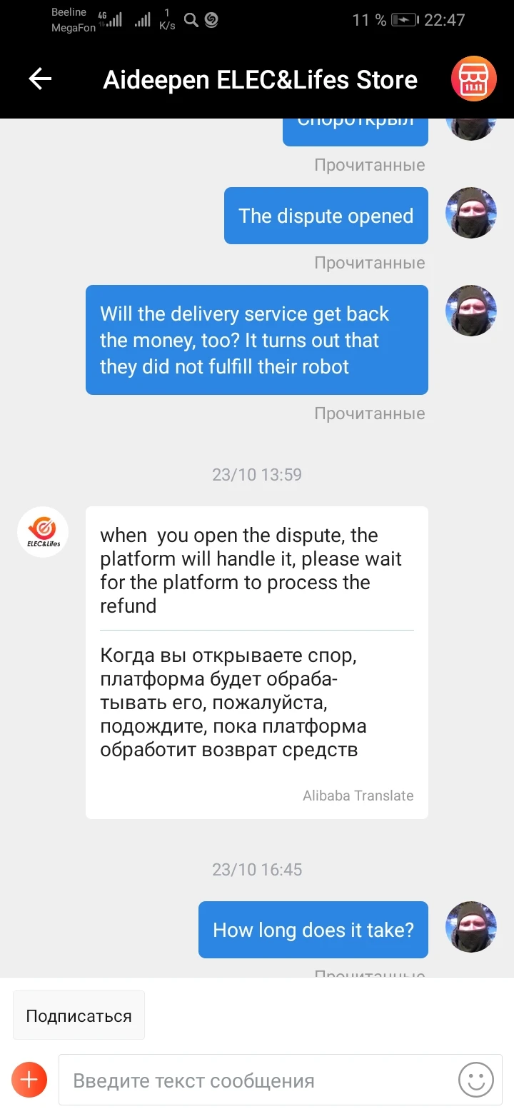 Я не получил свой заказ. Я потребовал, чтобы вы вернули мне деньги. Немыслимо, что вы можете сказать, что доставка была осуществлена, пока я не подтверждал получение. Спасибо за быстрый возврат средств. Привет.