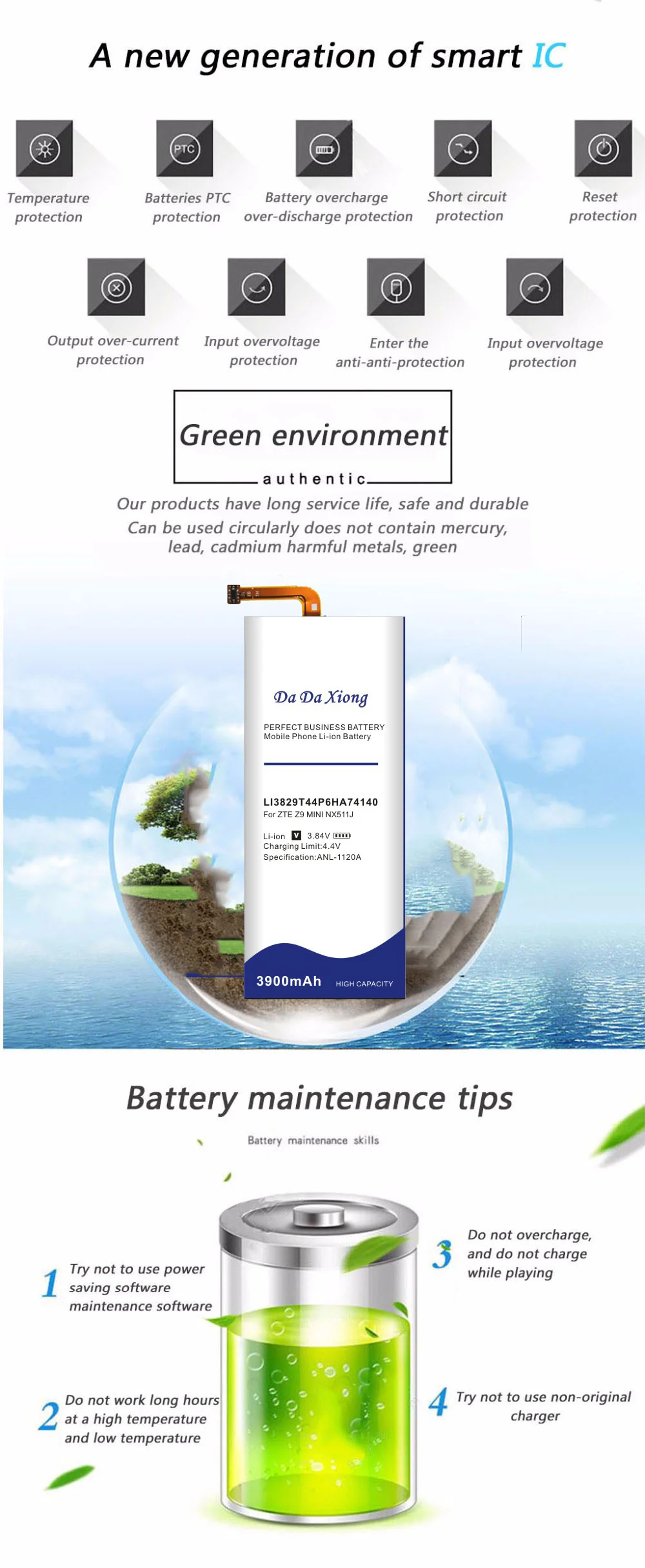 Емкость:3900 мАч Напряжение: 3,84 в Тип: li-ion Совместимость: дляZTE Nubia Z9 Mini NX511J Безопасность и окружающая среда: двойные функции защиты. Двойная электрическая плата IC и PCB защищают от разрядки заряда и короткого замыкания. Наша батарея того же размера с оригинальной батареей. Один год гарантии
