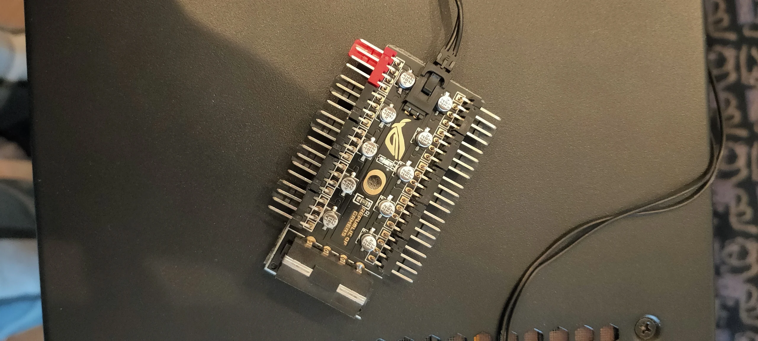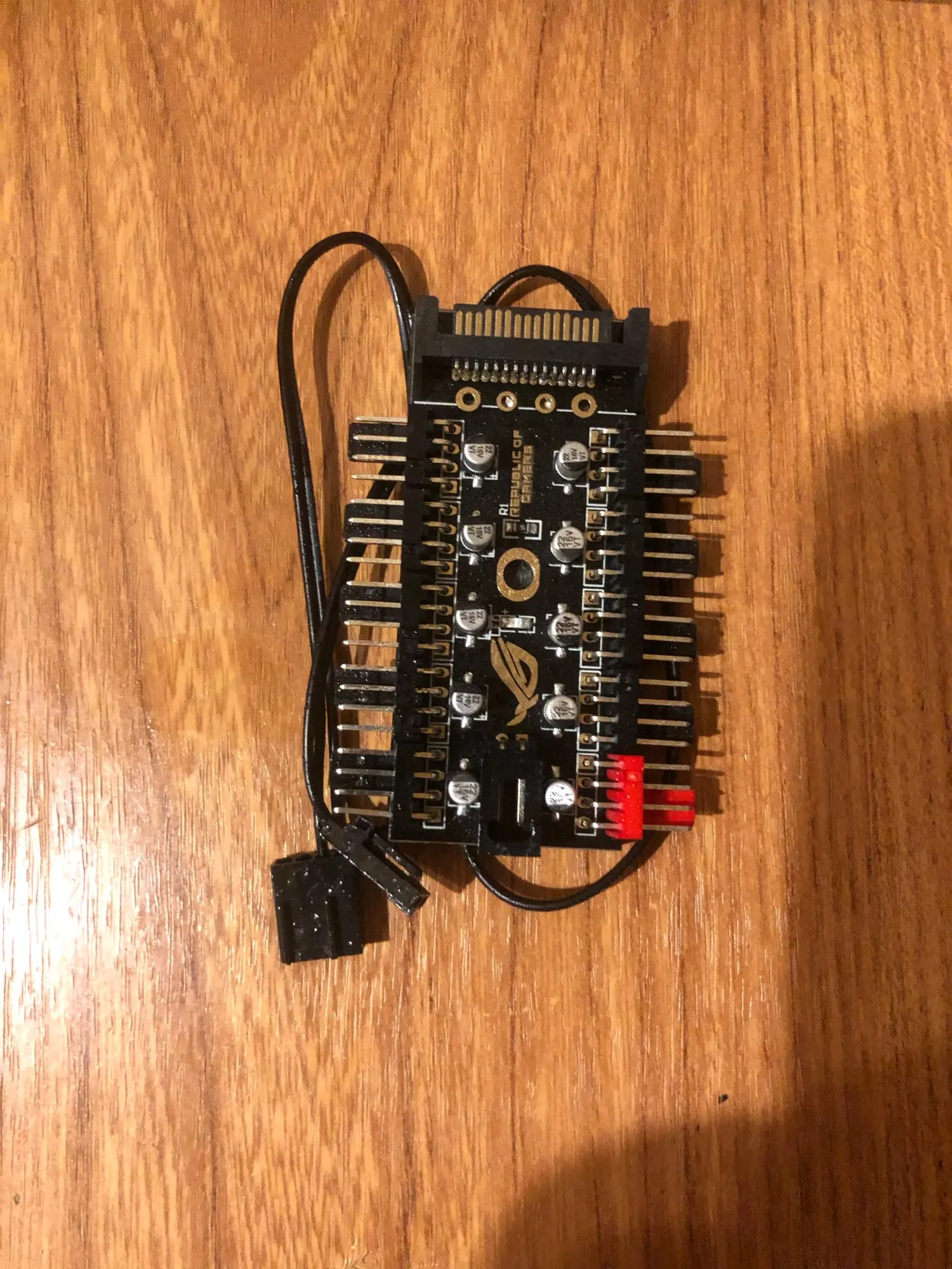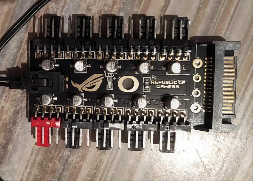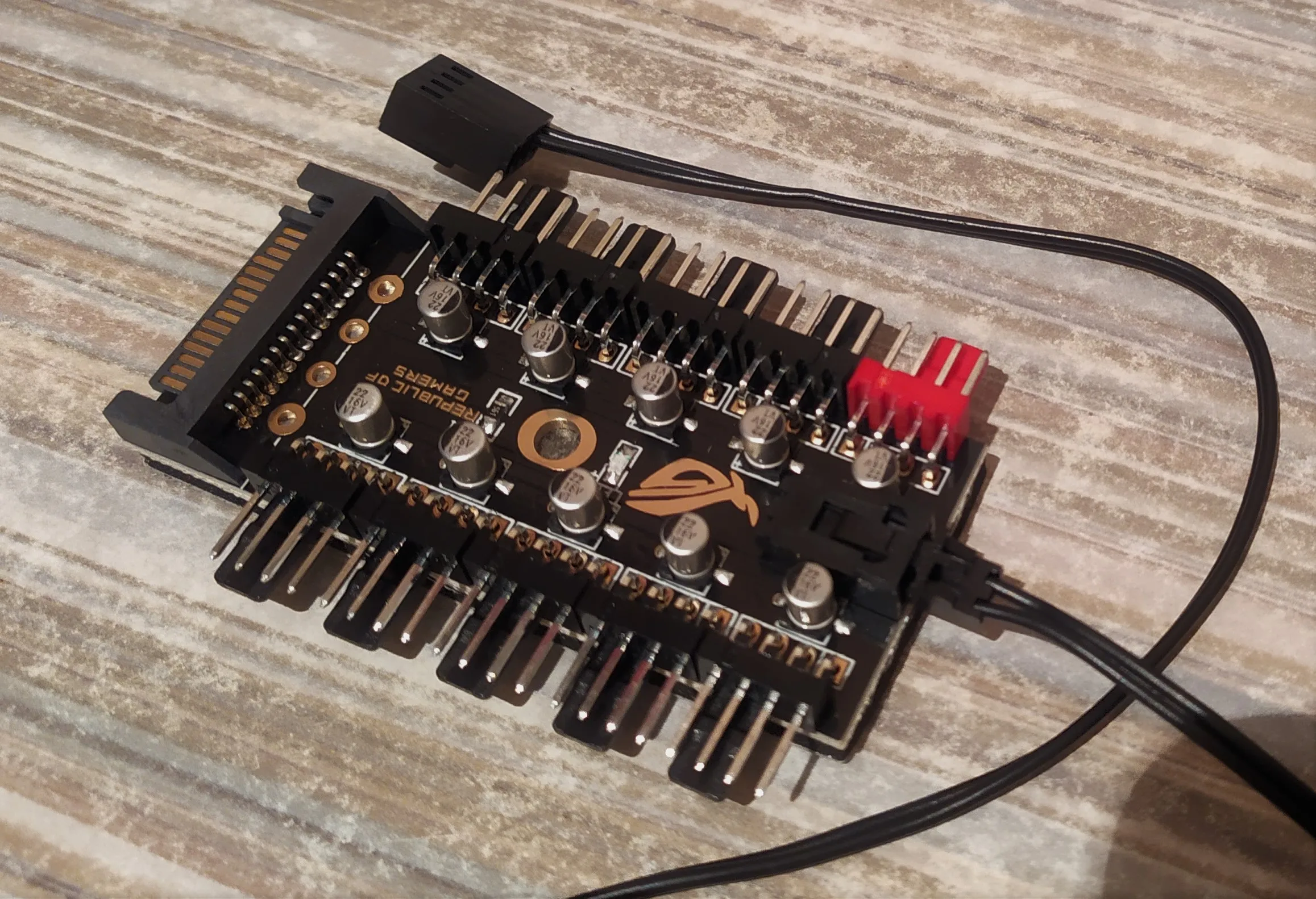 Отлично сделан, на двустороннем скотче. Он пассивный, но позволяет разгрузить цепи питания материнской платы при необходимости питать больше 1 вентилятора, в том числе корпусных с управлением от температуры процессора. Удобно, красиво - не хватает заглушек на неиспользуемые контакты - было бы супер.