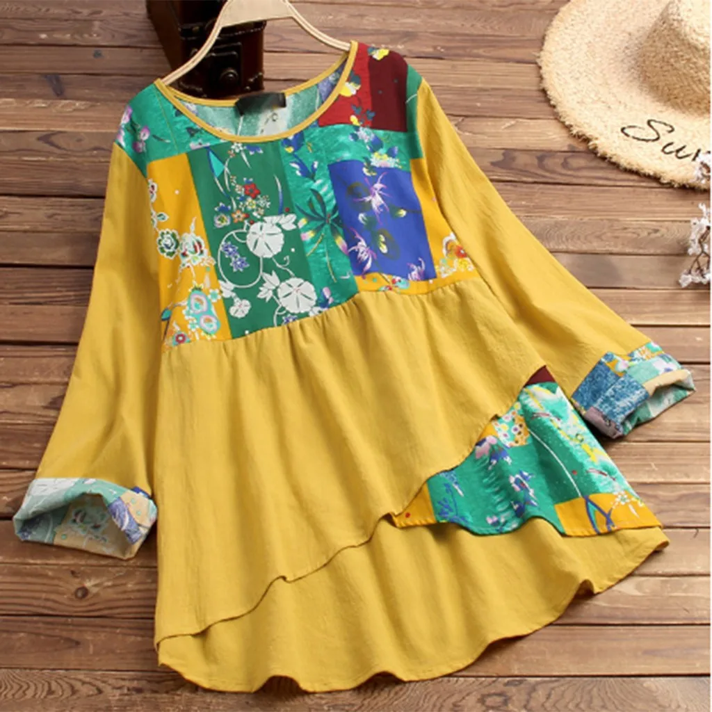Женская комбинированная блузка с принтом, повседневная свободная туника, рубашка, блузка, асимметричные топы, размера плюс, женские топы, женские рубашки