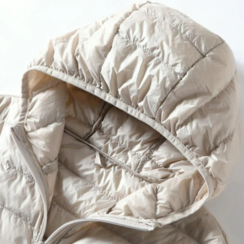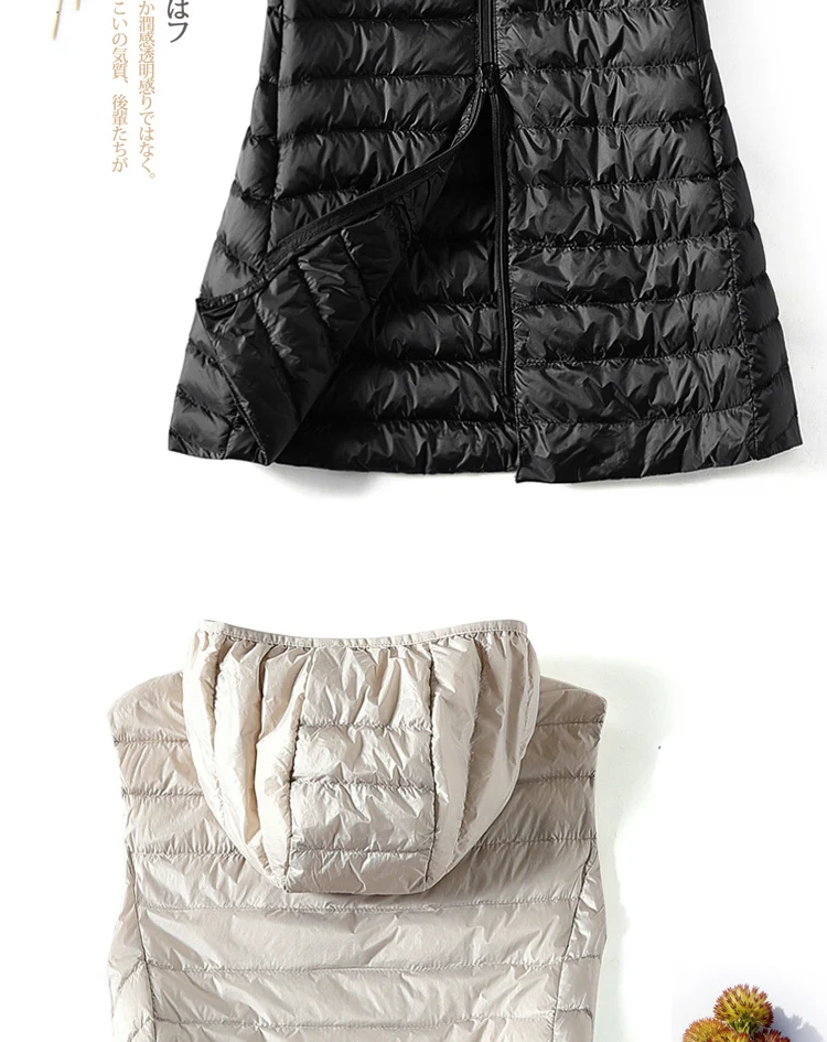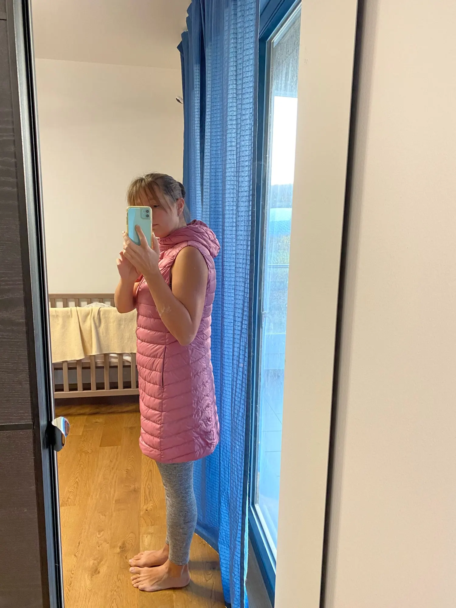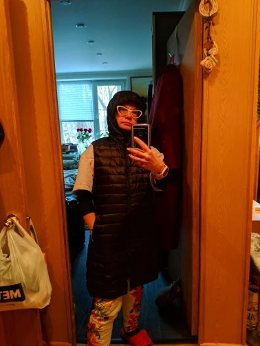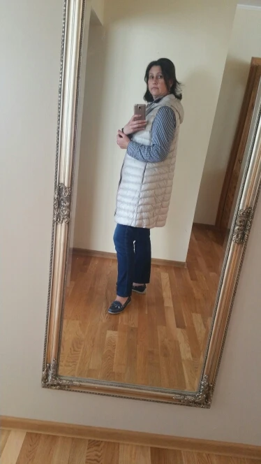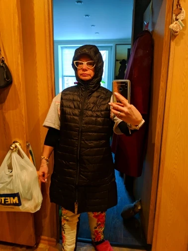 Желетка чудная! Закрывает попу, наилегчайшая, теплая, застёгивается на кнопки, пошита очень аккуратно, глубокие карманы застёгиваеются на молнию. Я ношу 52-54 российский размер. На большую грудь будет тесно. Но НЕТ КАПЮШОНА!