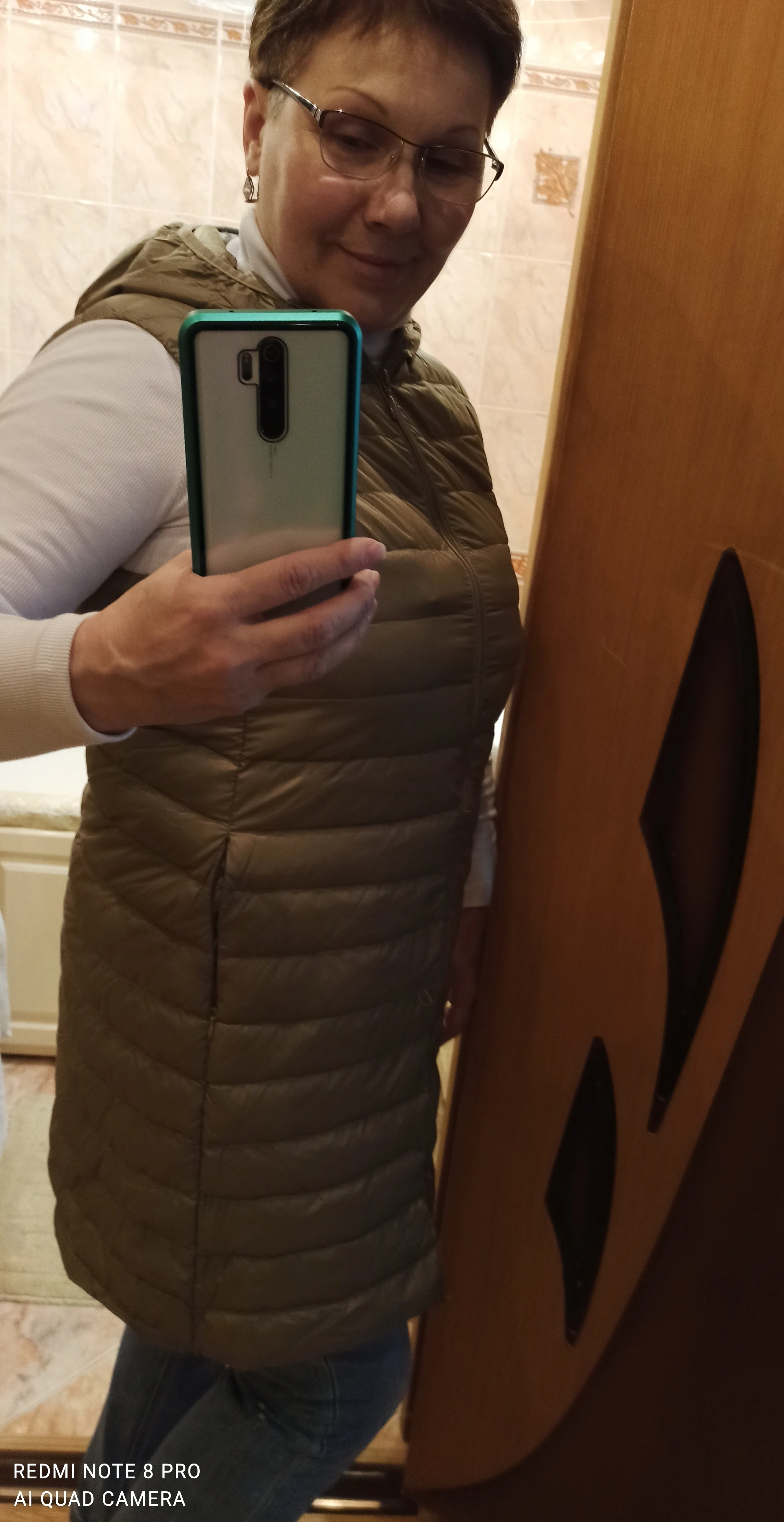 спасибо продавцу, жилетка сшита качественно, доставка 18 дней в Архангельск. На 50-52 взяла 3xl. Подошла хорошо, не сильно свободна, но и не висит. Приталена, как на фото, выше колена на 10 см при росте 165 см. Пуха мало, тоненькая, брала на весну и осень, носит с худи. Отличных продаж!