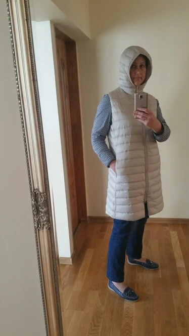 Отличный жилет! Легкий, тонкий, есть маленький мешочек, куда его можно сложить и взять с собой. На 44 рус XL подошел отлично, наденется и на толстый свитер, и на тоненькую водолазку будет хорошо. Покупала, чтоб носить зимой под пальто как обычную жилетку.