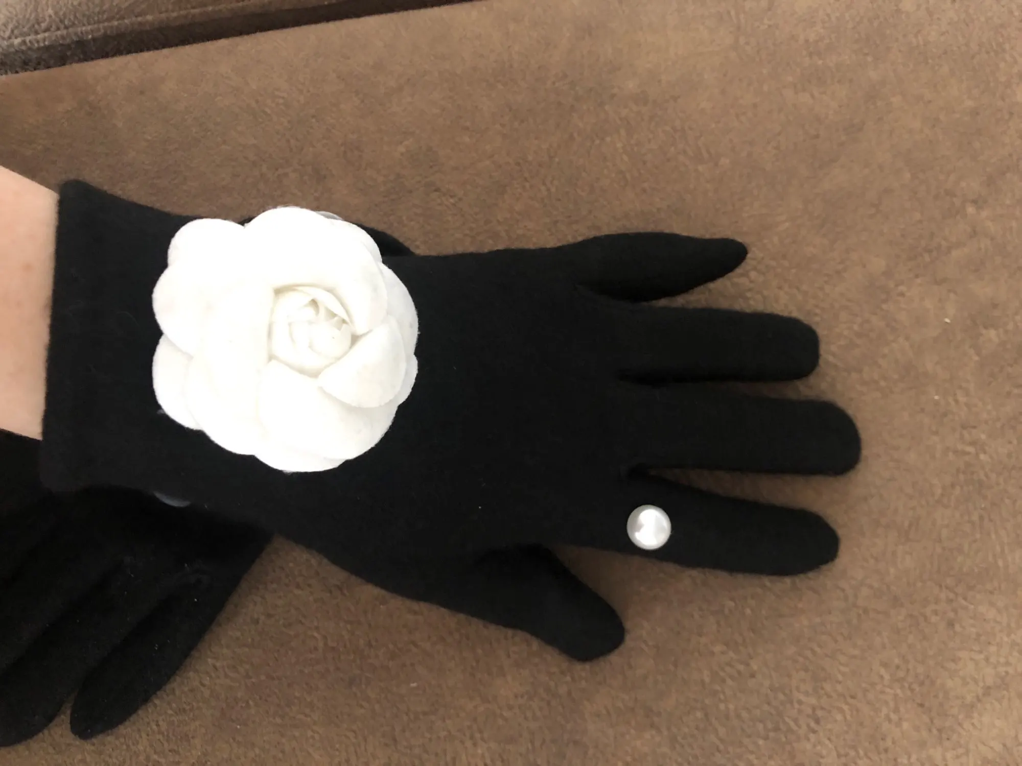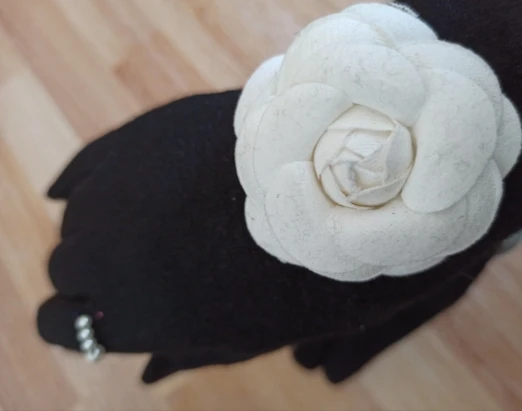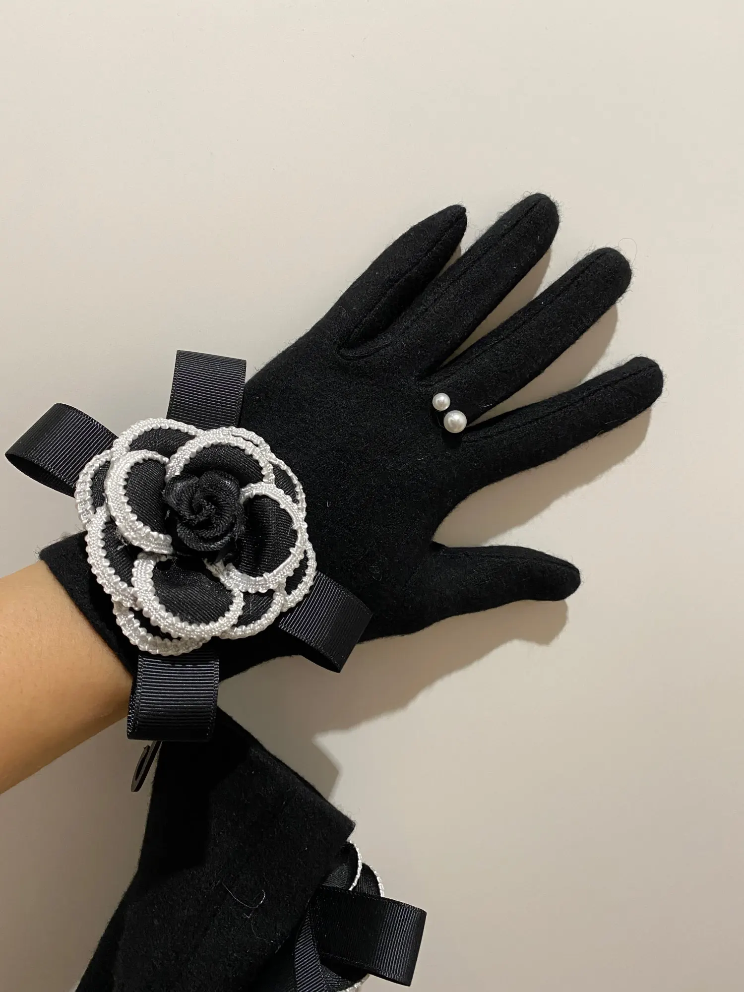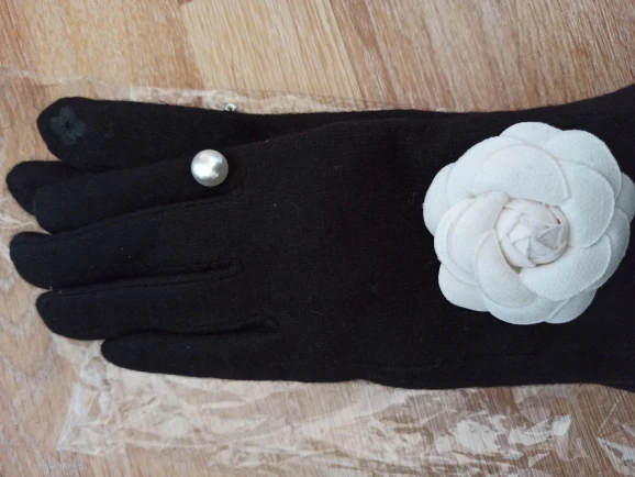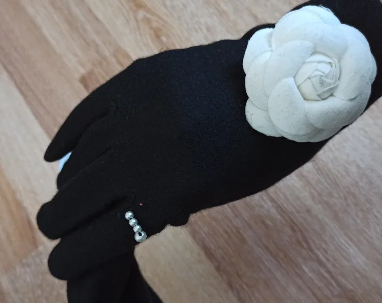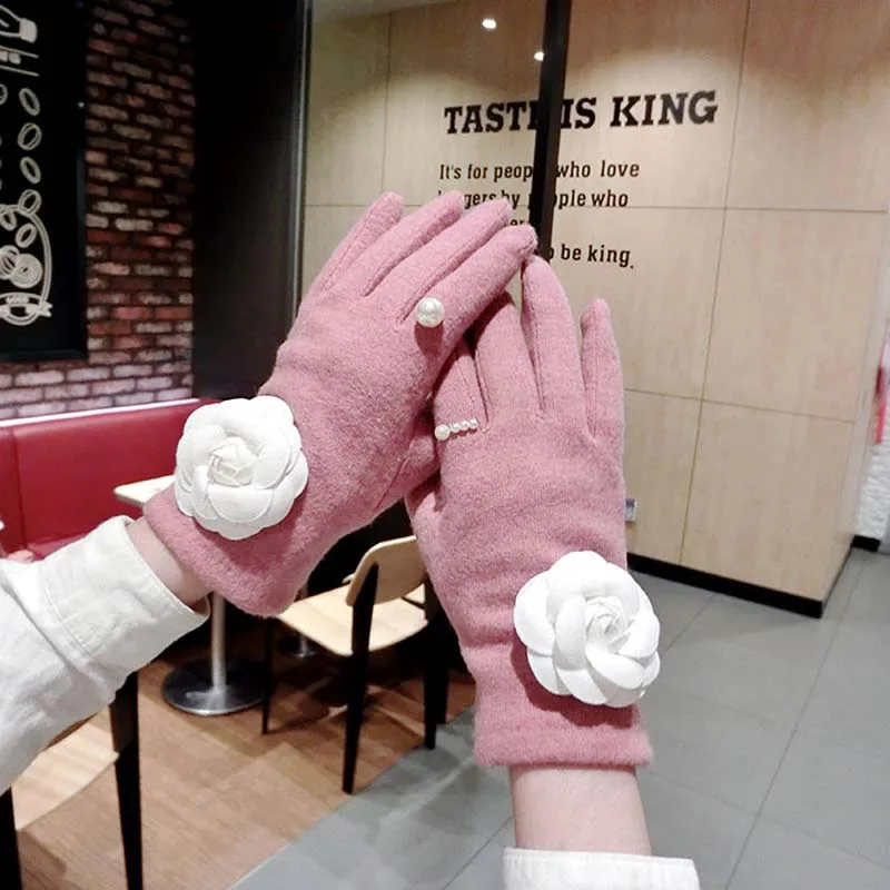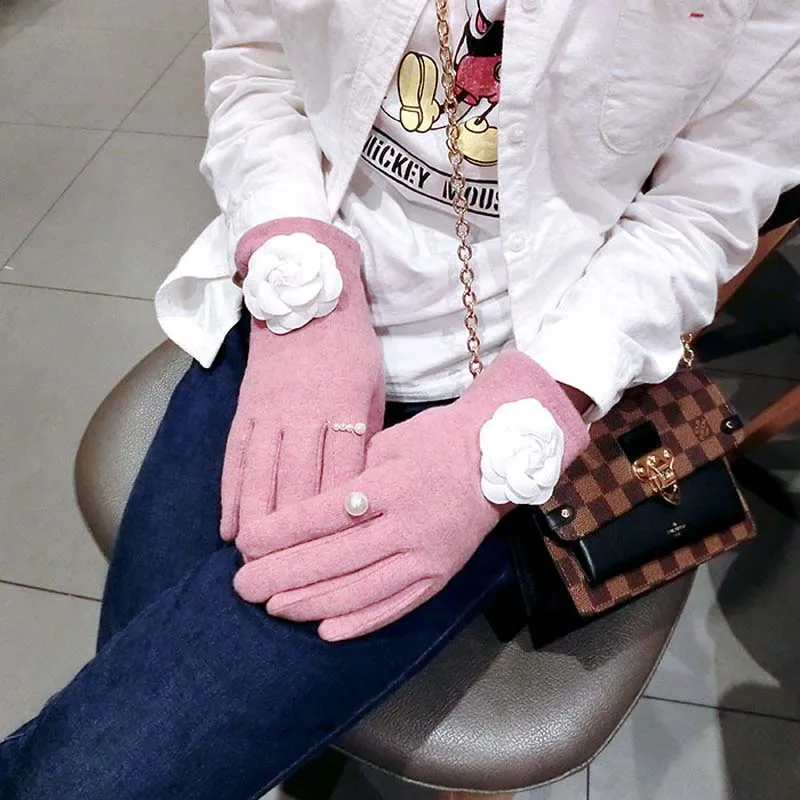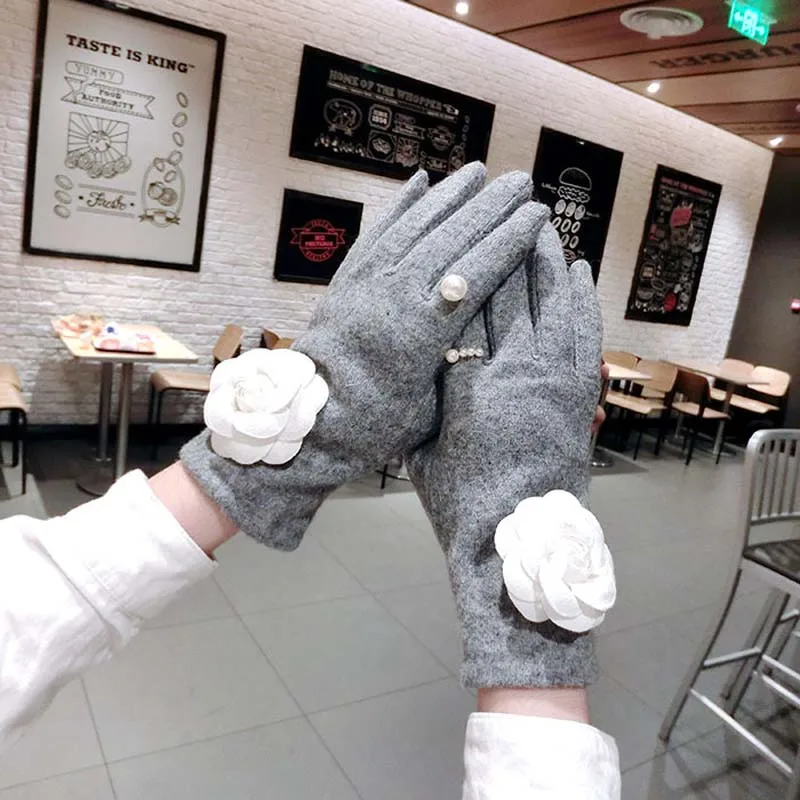 Модные зимние белые перчатки камелии, женские кашемировые перчатки с жемчугом и сенсорным экраном, сохраняющие тепло, новые корейские перчатки для улицы