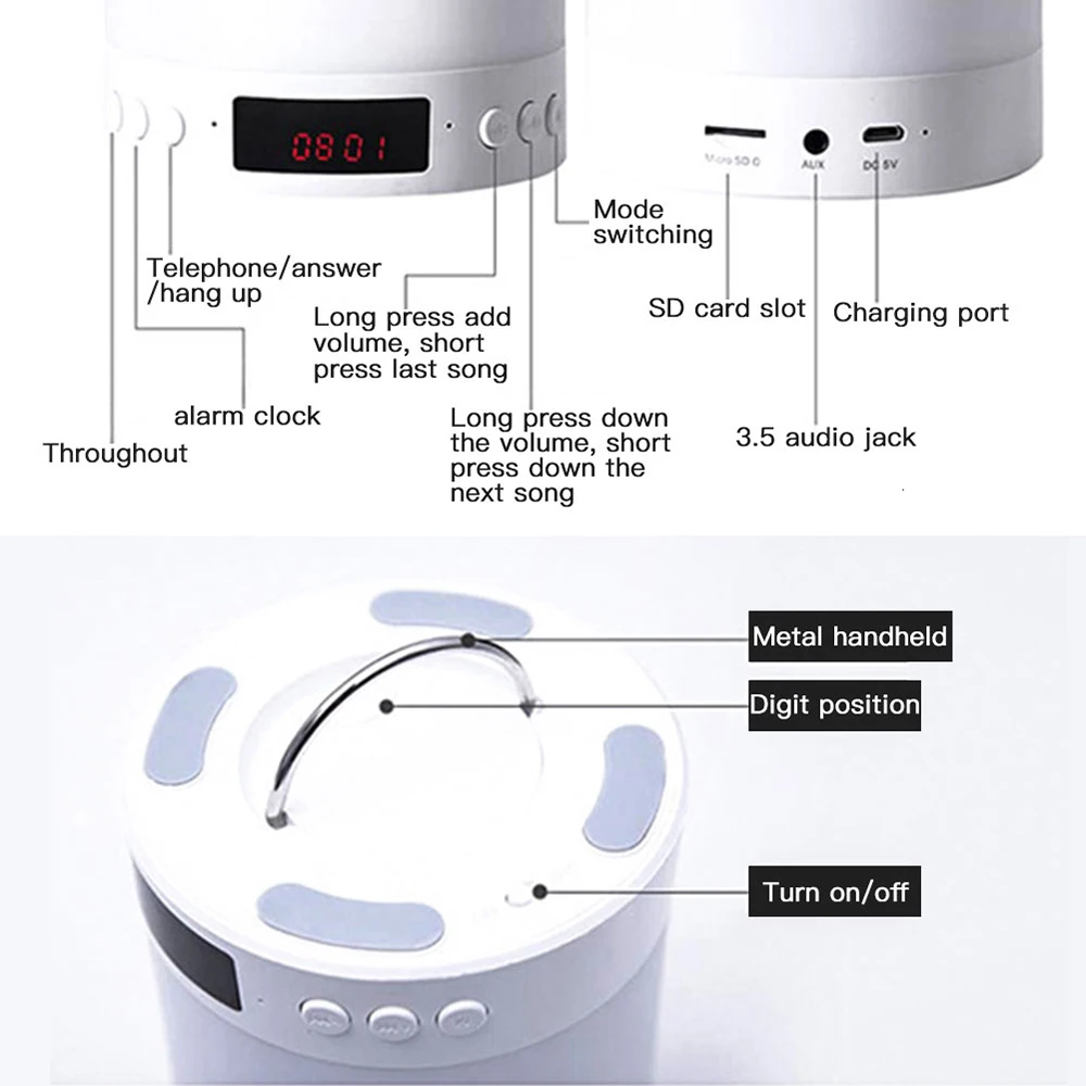 Материал низкого качества и имеет ужасный звук, который звучит слишком громко при подключении bluetooth или радио. Кнопка питания находится в базе ка, а не спереди.