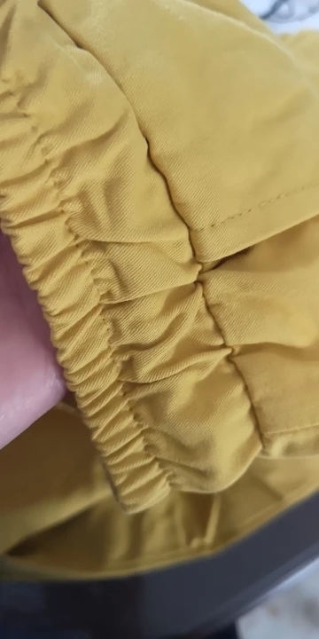 Очень классная ткань и цвет! Плотный хлопок, красивый песочный цвет. Просто любовь!но у них очень странный крой, выглядят не так как на заглавной фотке, скорее так, как на фото без человека! На мой 46-48 и 165 рост брала самый большой размер.