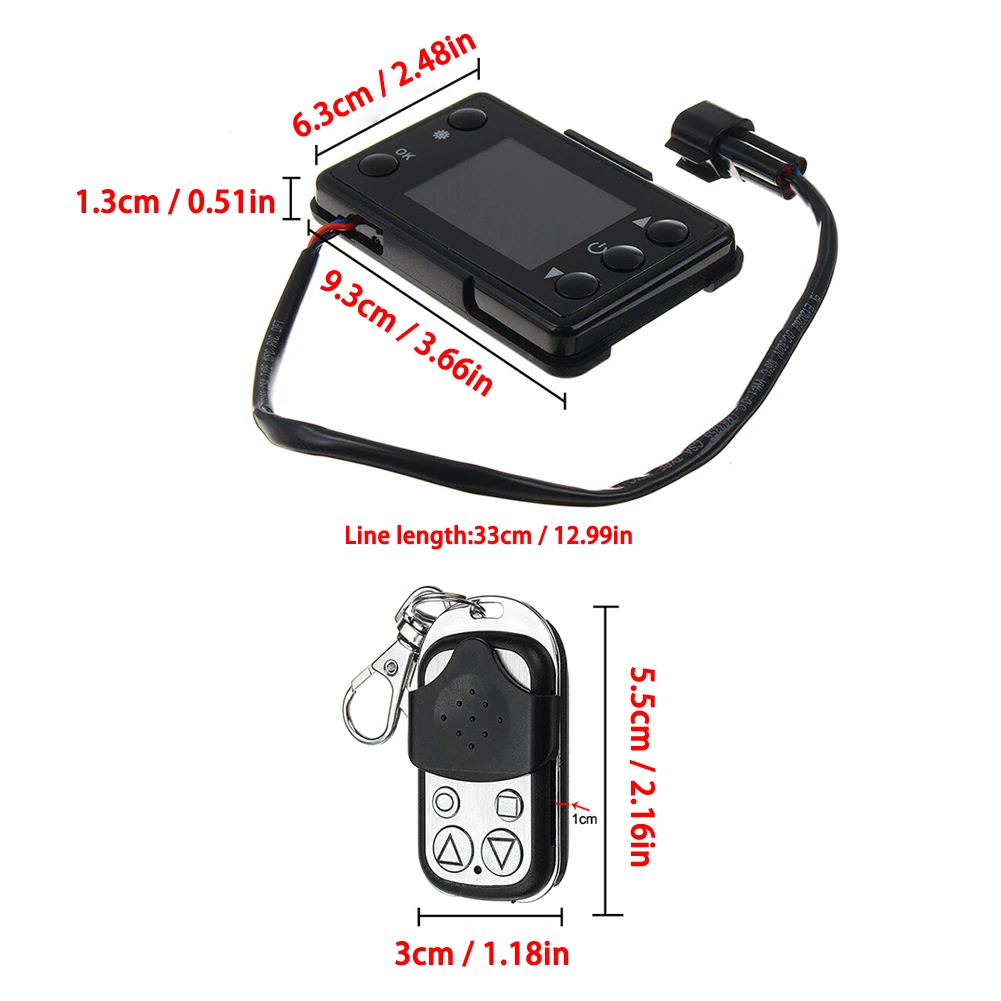 Спецификация:* Цвет: черный* Напряжение: 12/24V* Мощность: 5000 (кВА)* Материал: пластиковый чехол* Длина кабеля: 33 см* Размер: прибл. 9,3*6,3*1,3 см/3,66*2,48*0,51"* Размер пульта дистанционного управления: прибл. 5,5*3*1 см/2,16*1,18*0,39"* Адаптированные модели: Универсальные* Как определить, подходит ли он для вашего парковочного нагревателя: Проверьте, какой тип ЖК-дисплея у вас есть на оригинальном ЖК-экране. Если ЖК-экран сломан, вам нужно иметь такой же ЖК-экран.