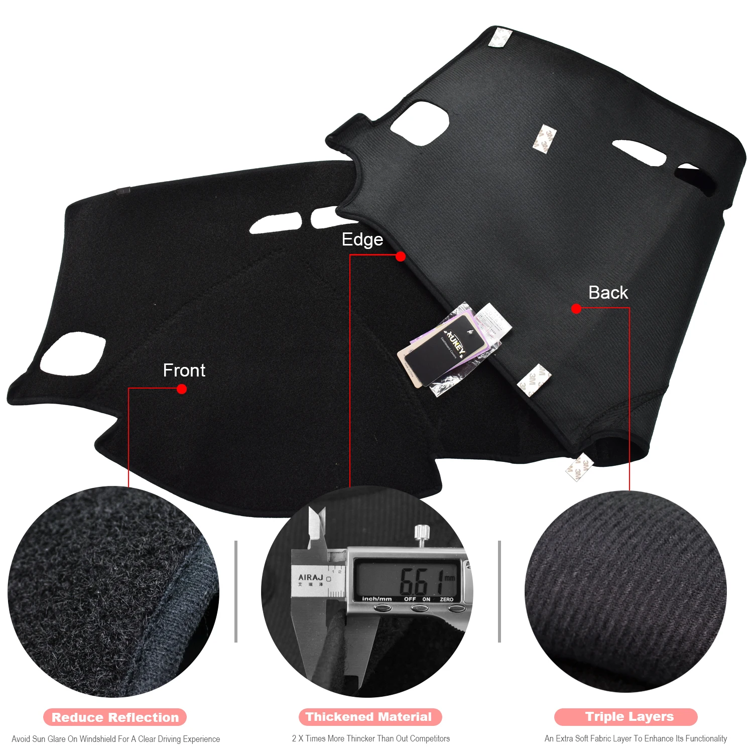 Особенности:Контуры, чтобы соответствовать приборной панелиНе садится, не выцветает и не искажаетЗащищает приборную панель от УФ-лучейИзбавляет от трещинНе бликуетУФ стабилизированная Высококачественная полиэфирная Автомобильная тканьДышит для рассеивания теплаБольшие вентиляционные вырезы, чтобы не ограничивать запотевающий поток воздуха