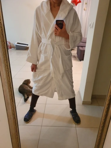 Халат замечательный, толстый и тёплый. После принятия душа в нем очень уютно! Заказала размер L, но потом засомневалась, что будет огромным и попросила продавца прислать размер м, продавец ответил, что размер заменит, но отправил все таки L. В принципе и к лучшему, что размер L пришёл, т.к. после стирки возможно «сядет» немного.