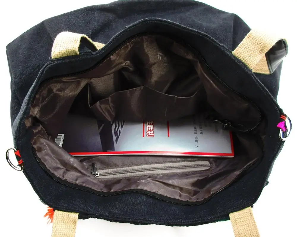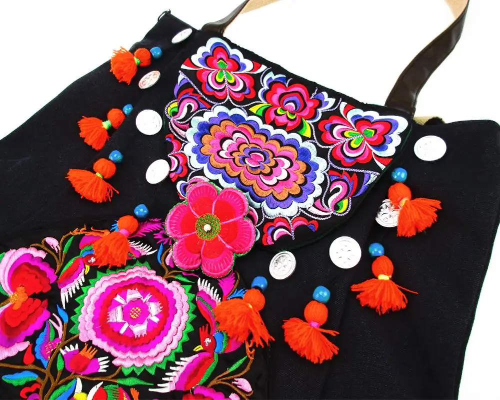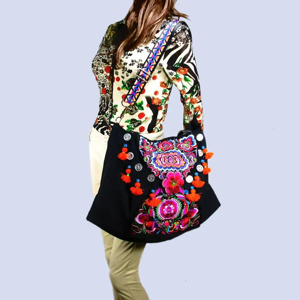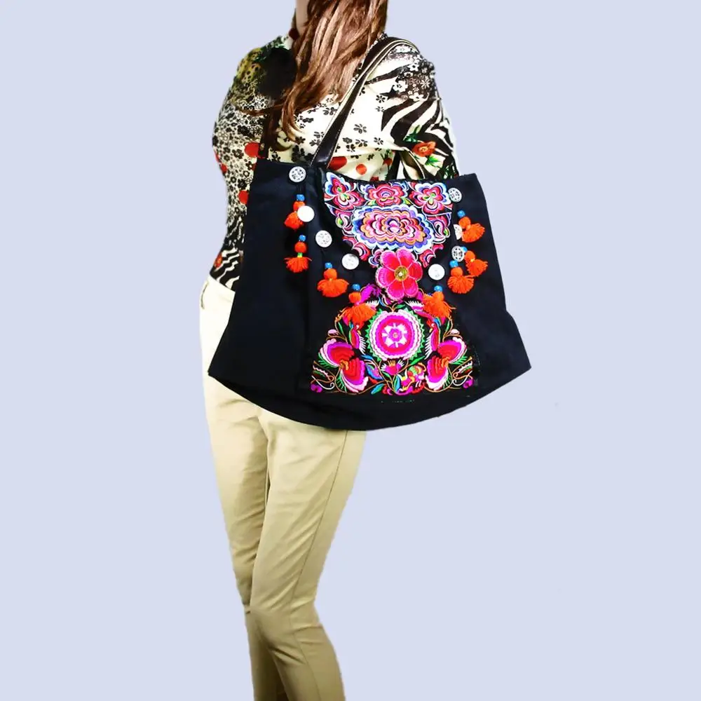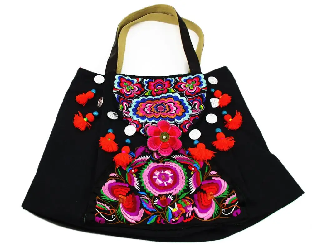 2 варианта использования Hmong винтажная Этническая плечевая сумка-мессенджер Hmong в этническом стиле, сумка-тоут ручной работы, сумка-колокольчик с вышивкой и помпоном, женская сумка