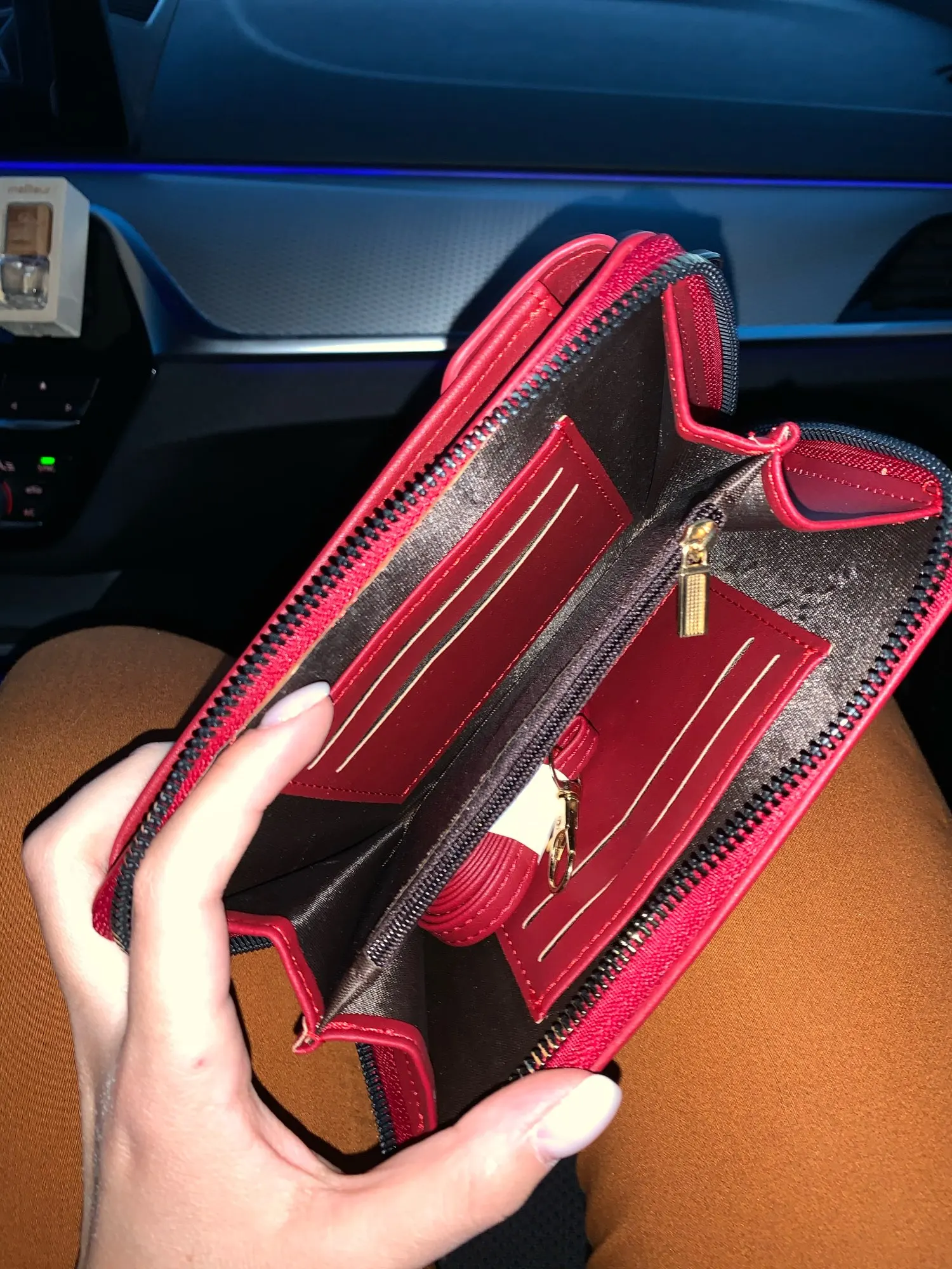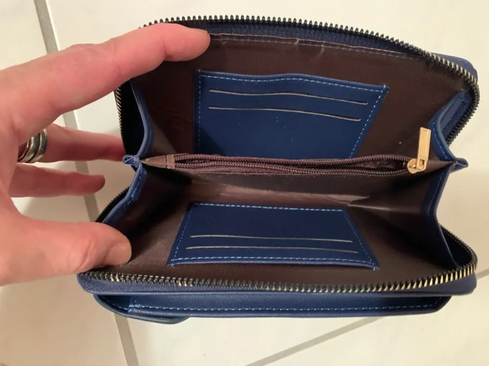 Цвет идентичен изображению. Очень хорошо Слишком маленький, чтобы вместить чековую книгу, однако карты лояльности телефона очень довольны.
