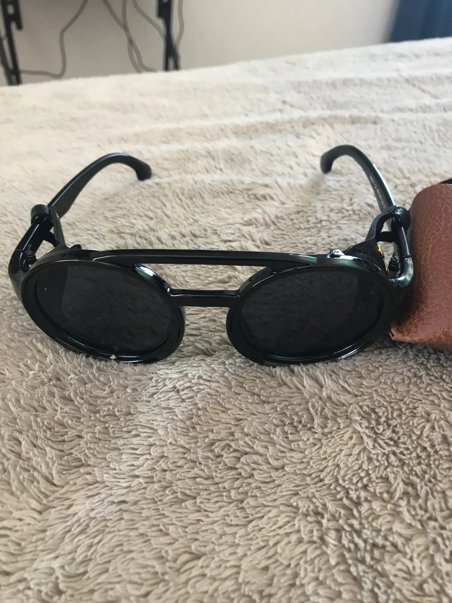 Очки брала наудачу, оказались больше всё-таки мужскими, муж в восторге, не вылазит с них теперь)) качество хорошее, а боковые кожаные закрывашки ооч удобны за рулём, когда сильное солнце)