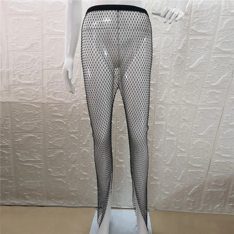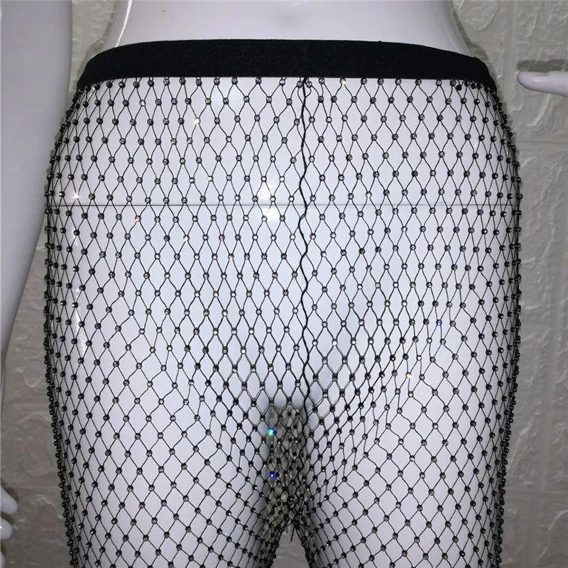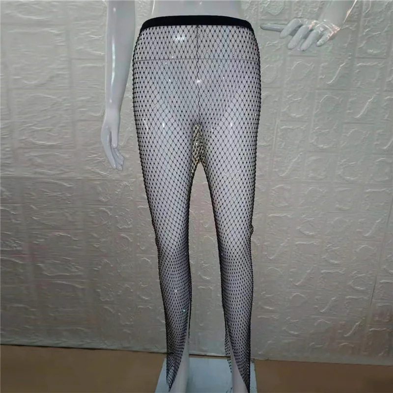 Сетчатые Блестящие Брюки со стразами прозрачная эластичная талия свободные сексуальные женские длинные брюки для вечевечерние НКИ клуба