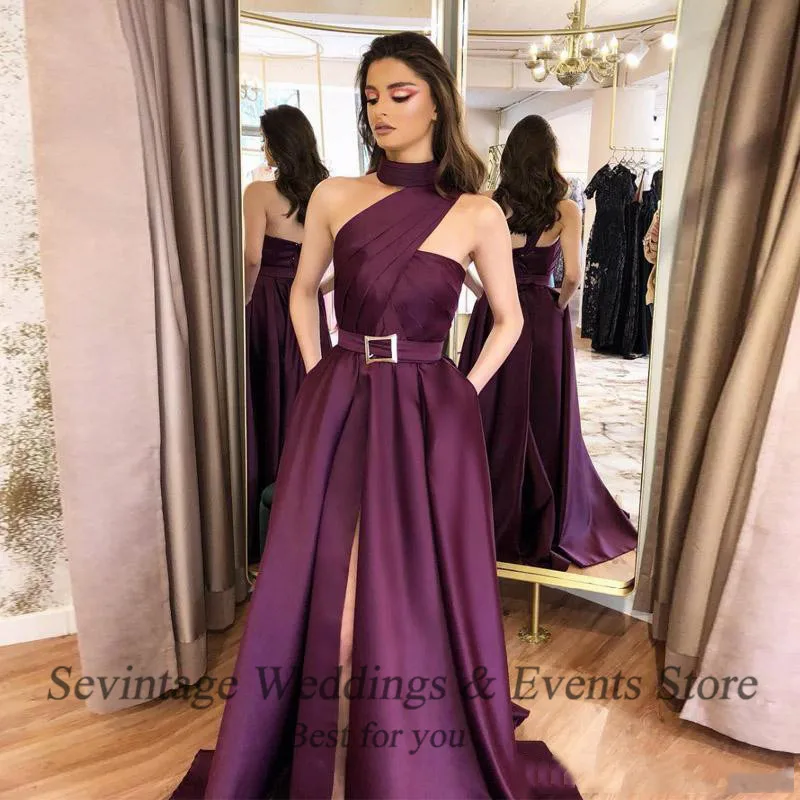 Длинное вечернее платье Sevintage с лямкой на шее, с поясом и карманами, с Боковым Разрезом, атласное выпускное платье, официальное вечернее платье