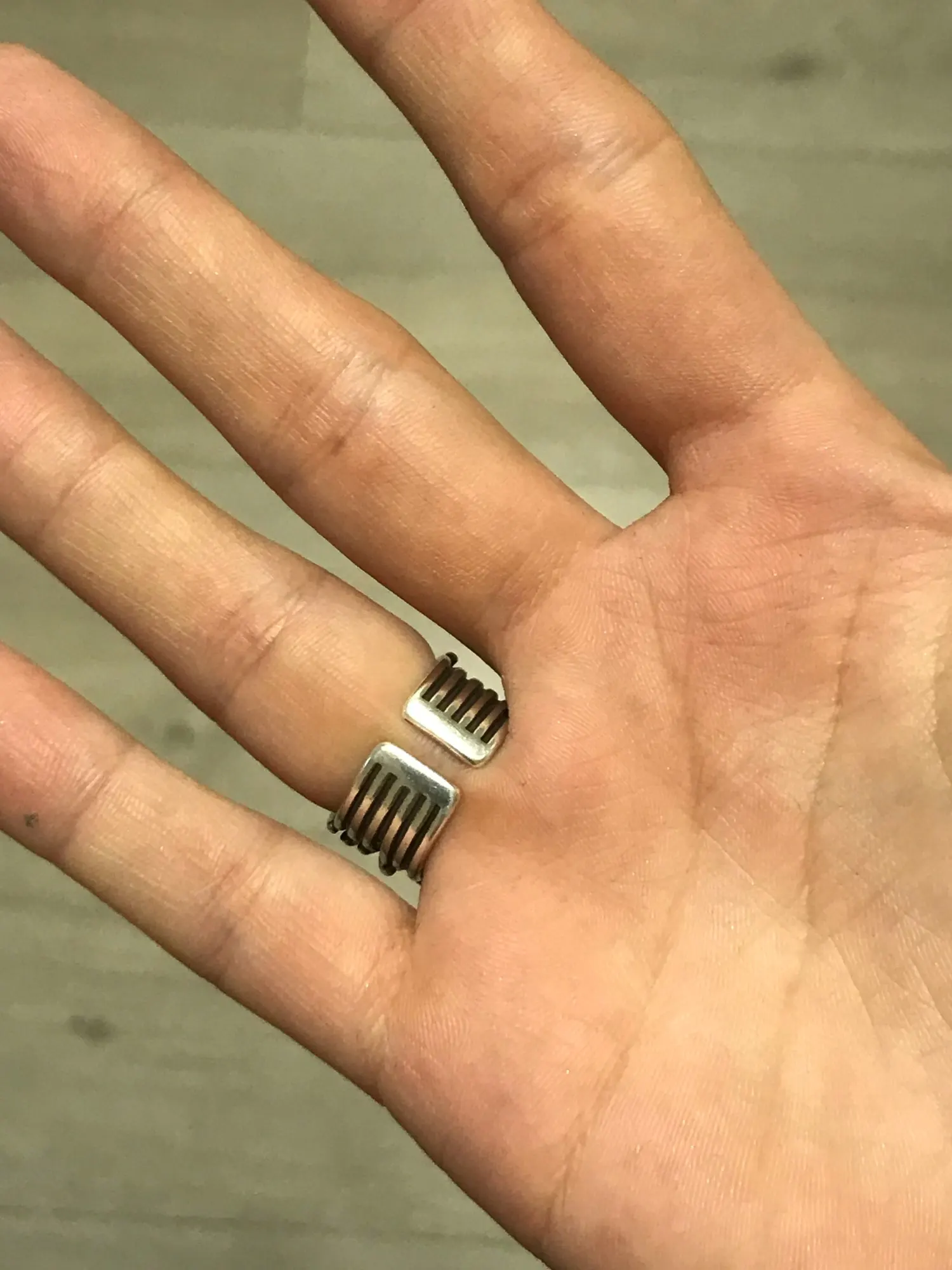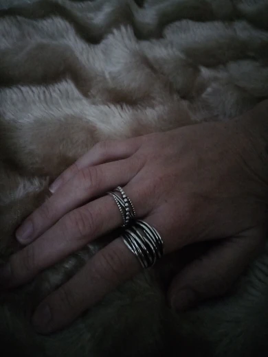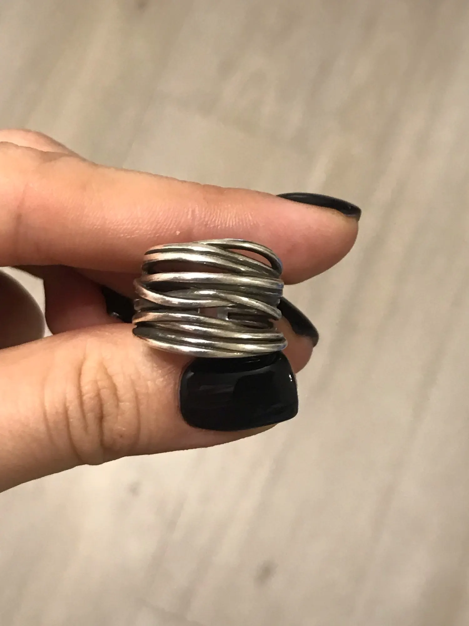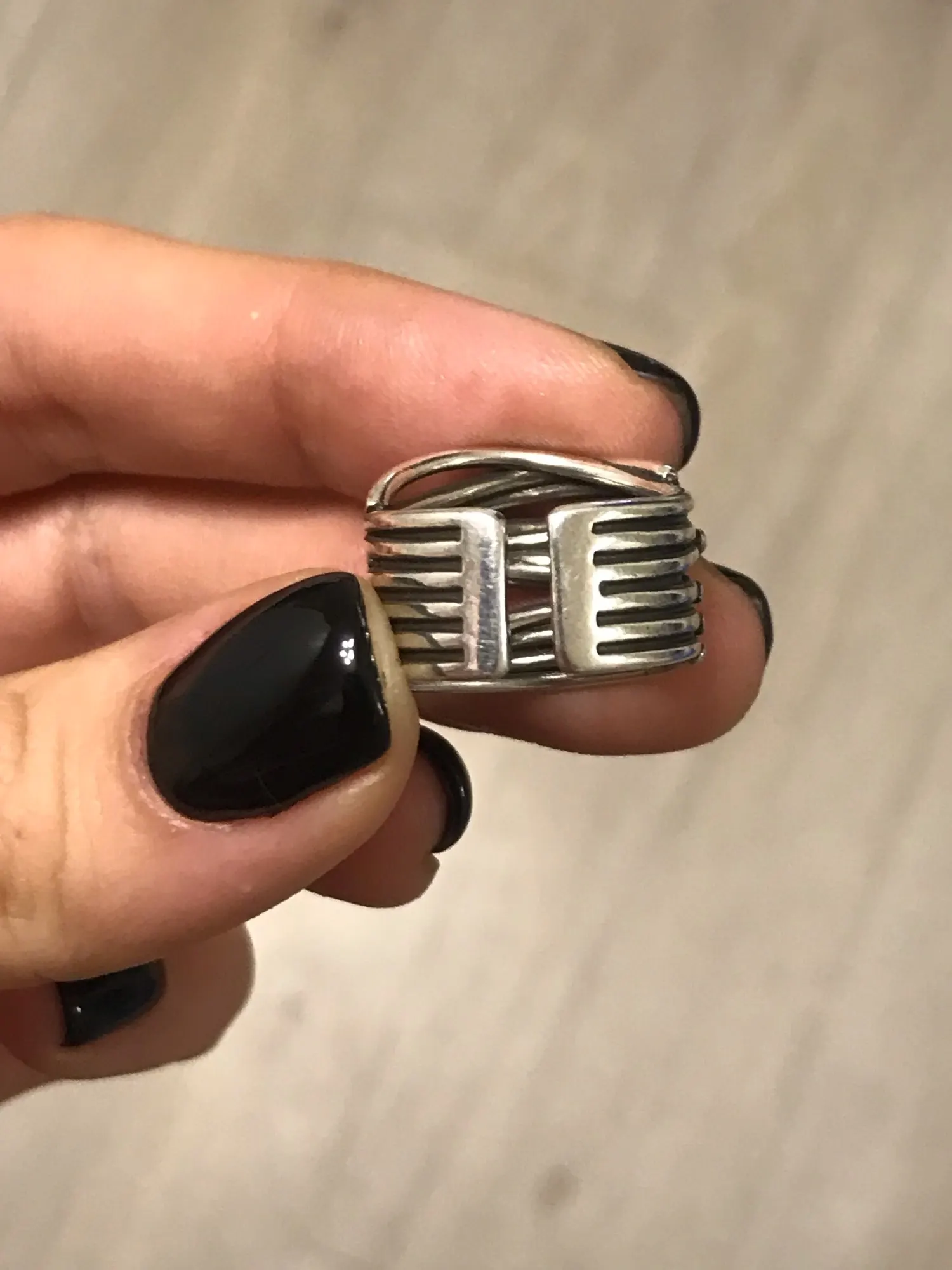Кольцо красивое и выглядит как на картинке, но вам нужна пара плоскогубцев, чтобы изменить его размер, и оно пахнет как железо. Я не думаю, что это серебро. Это оригинальный диаметр около 18 мм.