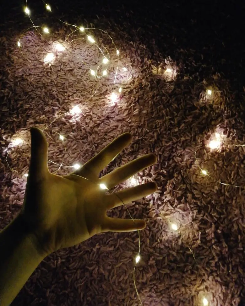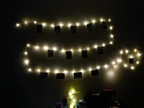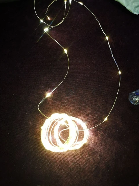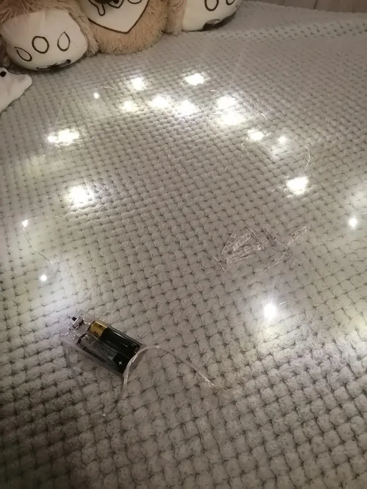 Очень приятная гирлянда. Работает от батареек, в наборе много прищепок, они выглядят мило, но я пока ими не пользовалась. Сама гирлянда выглядит хрупкой, но ничего. Я покрасила несколько лампочек маркером и получился розовый цвет. Сложила полосу в два ряда и вот что вышло. Рекомендую