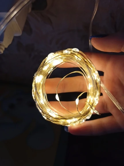 Гирлянда как в описании. Очень яркий приятный глазам тёплый свет (как и заказывала). Ровно 10 метров. Интервал между лампочками 10 см. Гирлянда на тонкой проволоке. Лёгкая. Спасибо продавцу. Я довольна покупкой.