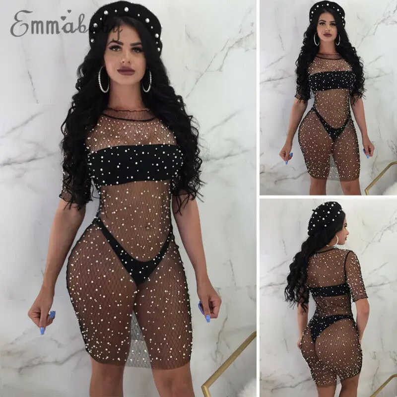 Женское летнее Сетчатое платье с блестками и кристаллами, накидка на бикини, купальник, купальный костюм, пляжная одежда