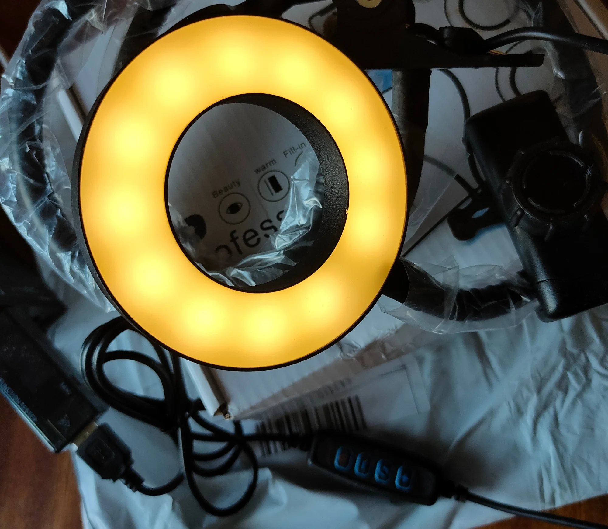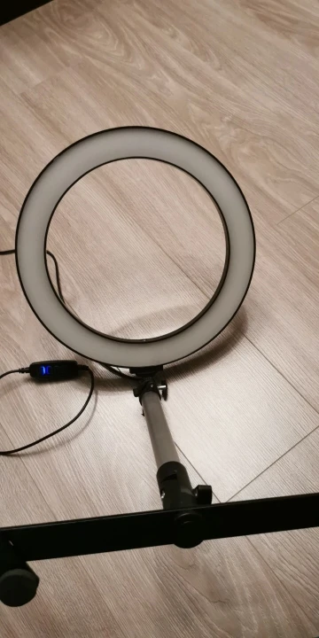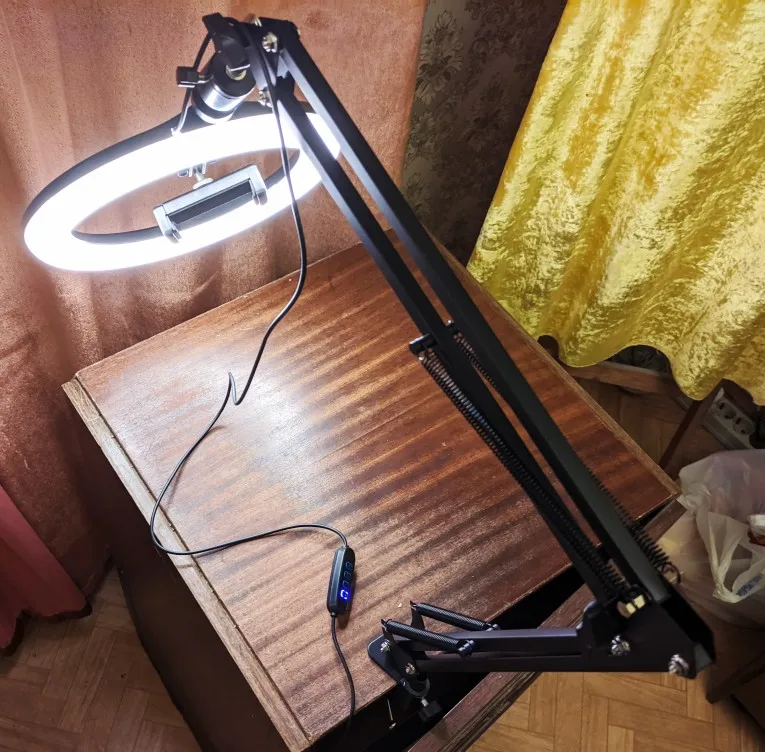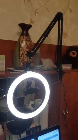 Доставка со склада в России до Волгограда заняла 5 дней (курьер привёз домой в целости и сохранности). Лампа при самом ярком освещении потребляет 0.6А при 5.18V - что означает мощность в районе 3 вт. Внешний диаметр кольца 9 см., внутренний 5 см. Яркость можно плавно изменять. Прищепка тугая, держит светильник и держатель со смартфоном крепко. Смартфон диагональю 6.57" поставил без проблем. Т.к. мне он там не нужен, то на это место установил вебкамеру ASHU H701 - зажал подставку, встала идеально. Этот гибкий держатель для вебкамеры предпочтительнее пантографа, т.к. у гибкого стержня-держателя куда большей степеней свободы, выше возможность регулирования. Мощности кольцевой лампы вполне достаточно для подсветки теневой стороны лица (на расстоянии до полуметра) , на худой конец можно использовать и как основной источник света, если позволяет светочувствительность вебкамеры (моя камерыа позволяет). К качеству изделия вопросов вообще никаких! И продавец не тянул с отправкой - рекомендую.
