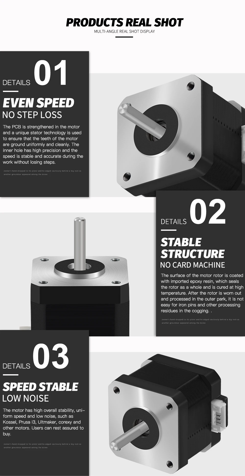 Описание мотора 3D принтера:T-Trees-инновационное высокотехнологичное предприятие, которое занимается производством и продажей 3D-принтеров, включая 3D-принтеры, аксессуары, расходные материалы и запасные части, для полного удовлетворения потребностей различных областей и регионов. Продукция продается в более чем 30 странах и регионах. По этой причине компания также создала и улучшила профессиональные крупномасштабные послепродажные команды и техническую поддержку. Он не только специализированный персонал для проведения онлайн-обучения эксплуатации для пользователей, но также обеспечивает ввод в эксплуатацию на месте, техническое обслуживание и другое универсальное обслуживание.