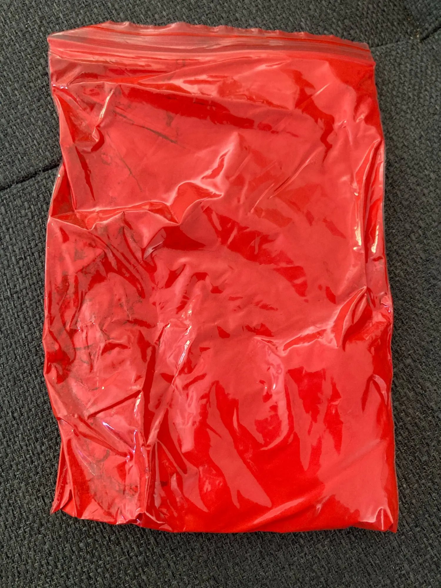 Это в полиэтиленовом пакете, который грязный, но цвет-блестящий красный, именно то, что мне нужно