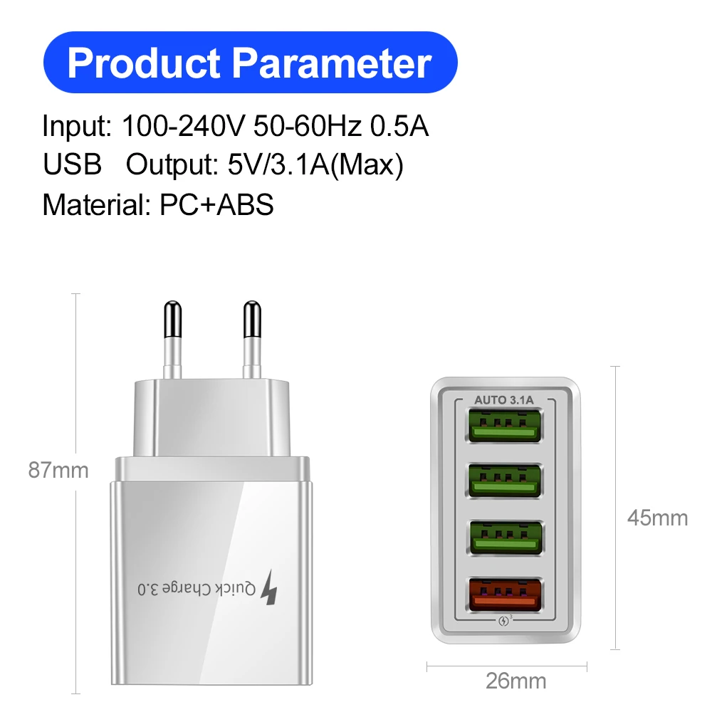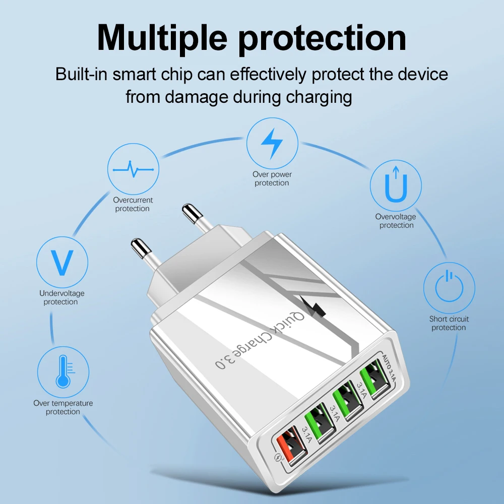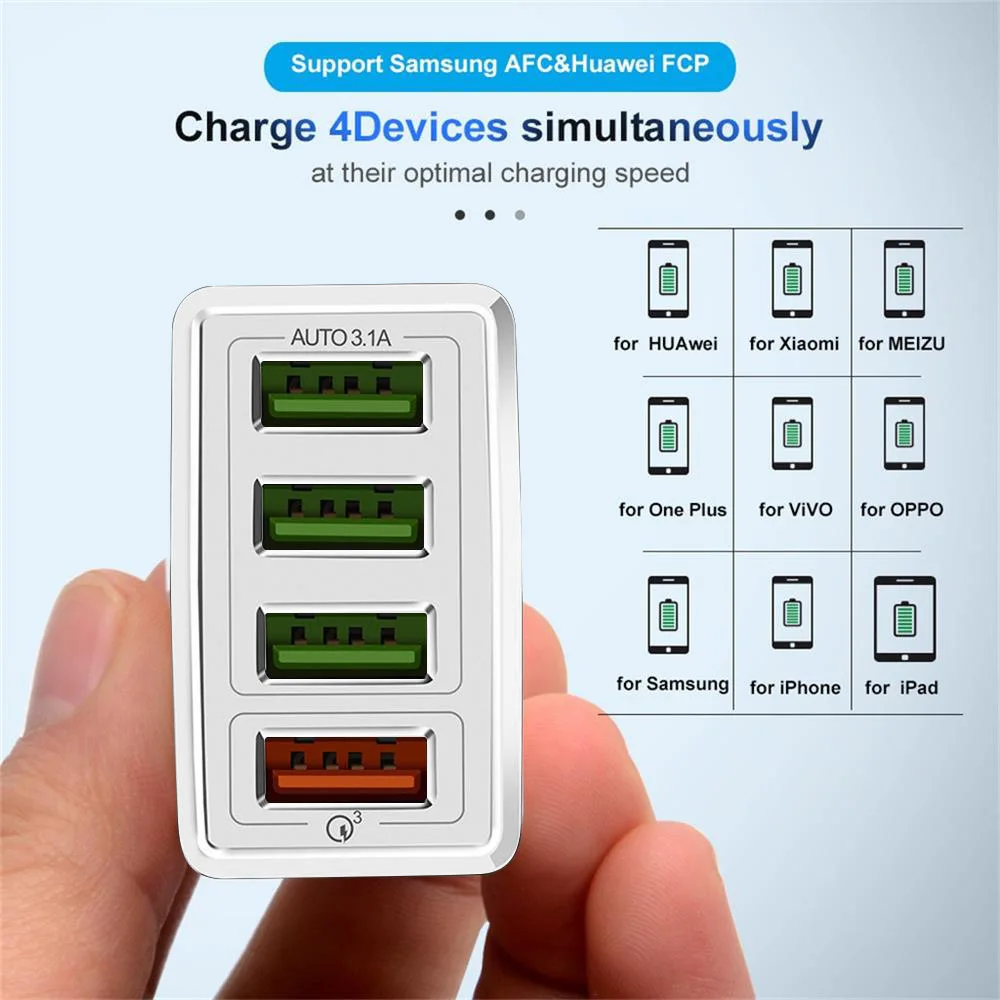 2. 4 порта USB (Быстрая зарядка 3,0 и 4 порта USB 5 В/A макс.), одновременно загрузите 4 устройства.