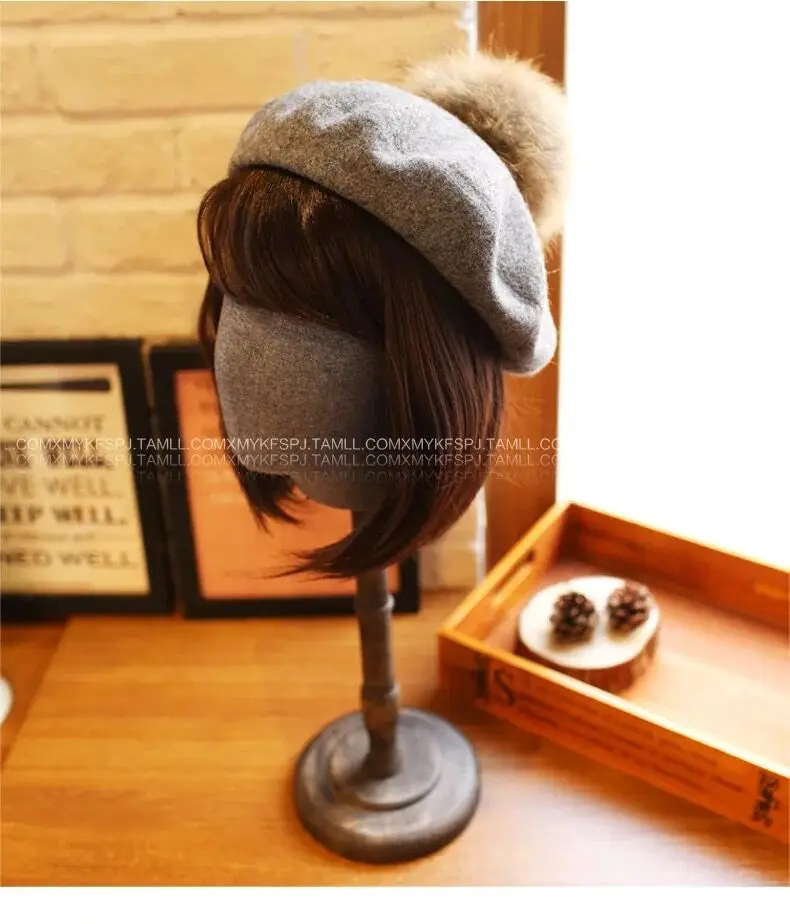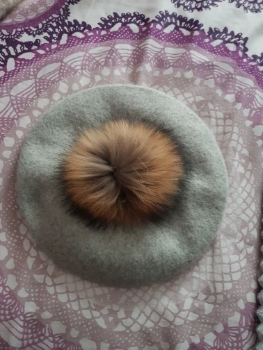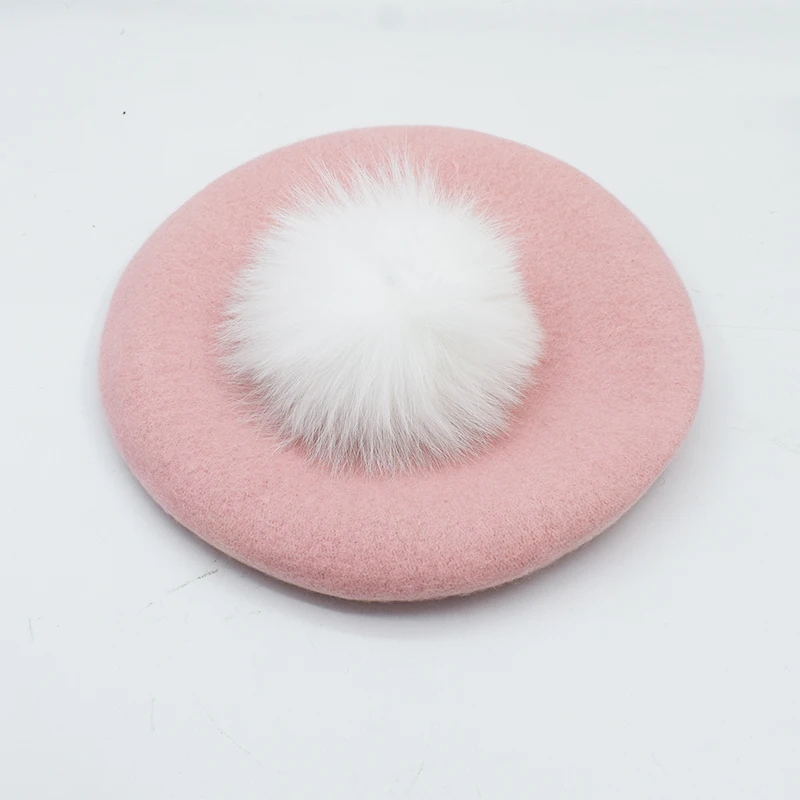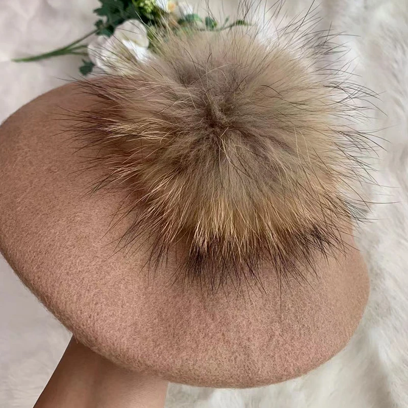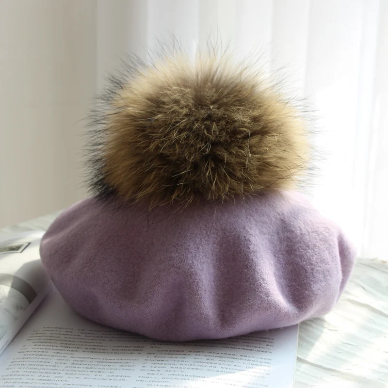 Берет женский шерстяной осенне-зимний, с помпоном из натурального меха енота