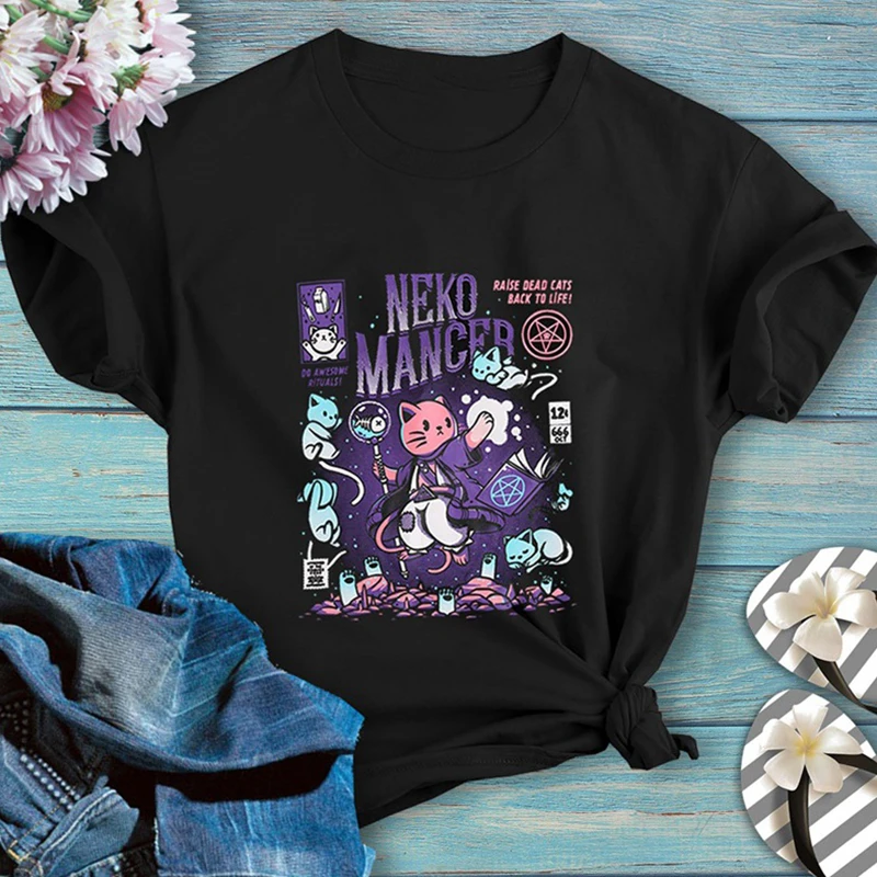 Футболка женская с принтом, винтажная тенниска в стиле Харадзюку, топ с коротким рукавом и мультяшным котом, Прямая поставка