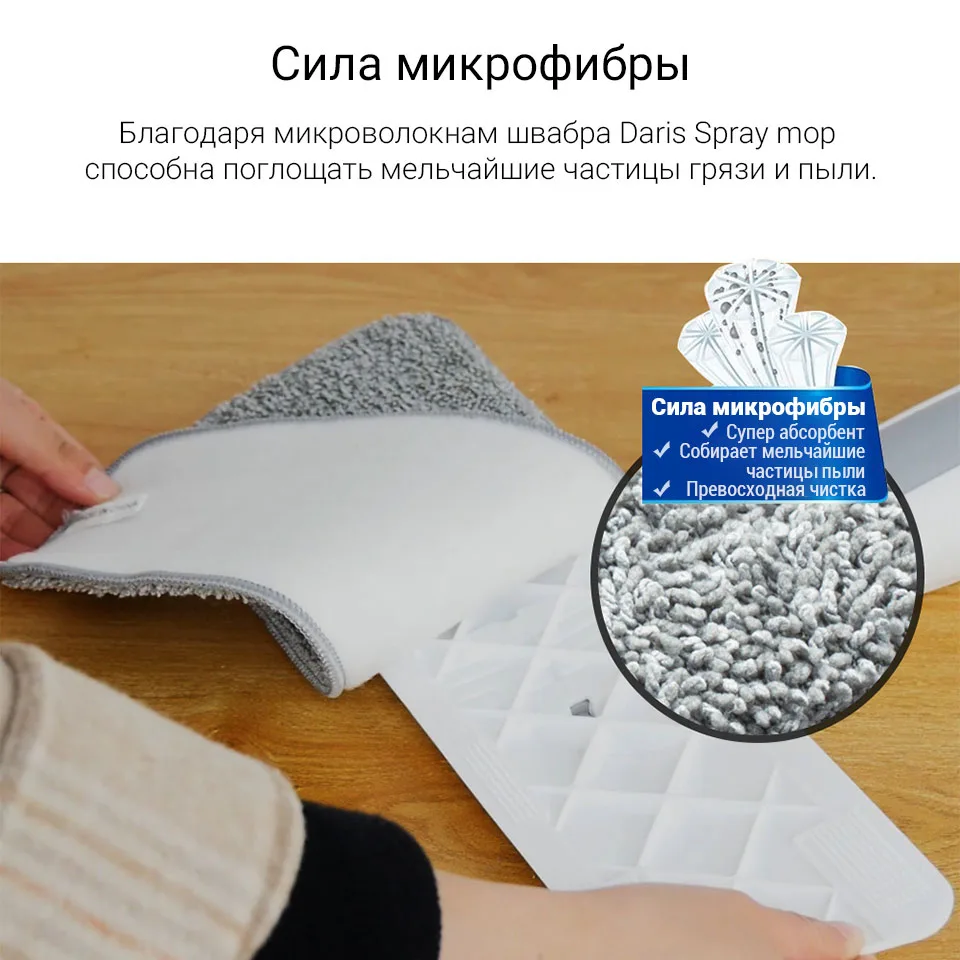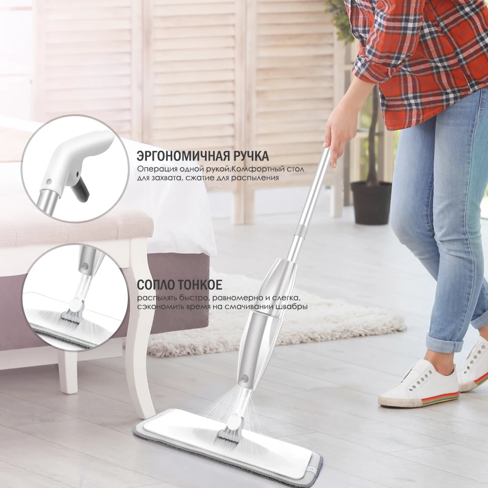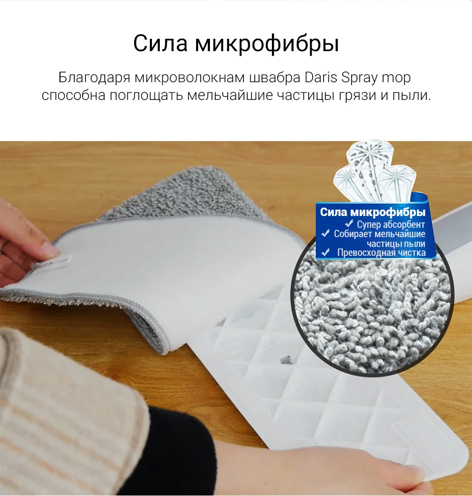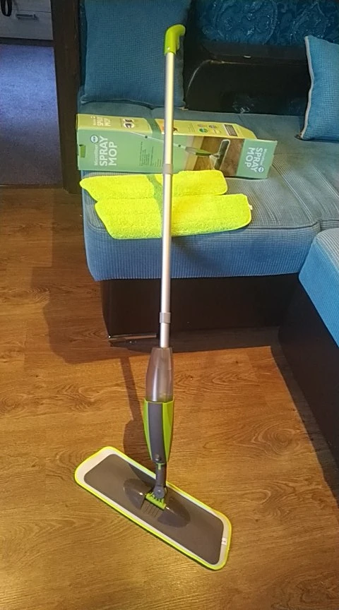 Удобная и лёгкая швабра. Насадки из качественной микрофибры, впитывают воду из рыспылителя быстро, моет пол без разводов. Рекомендую :)