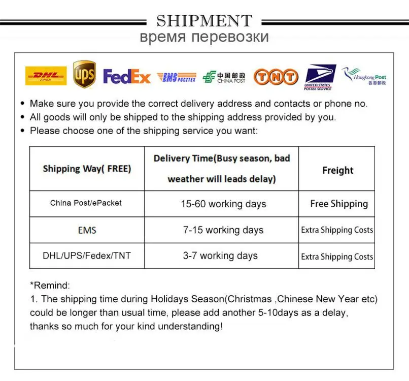 Примечание: Если вы используете DHL или другой способ доставки, с вас могут взиматься таможенные пошлины и налоги за товары, приобретенные онлайн. Покупатели несут ответственность за уплату таможенных пошлин.