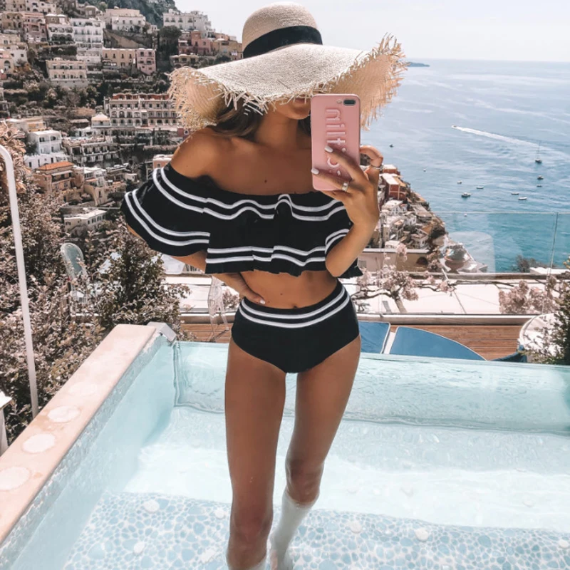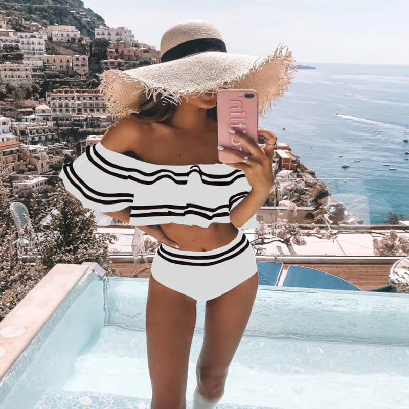 Женские комплекты бикини с оборками, элегантные полосатые топы с открытыми плечами и подкладкой, купальник с высокой талией, женский купальник из 2 предметов, 2020