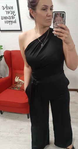 Отличный комбинезон. Элегантный. Не короткий на длинные ноги. Мне он немного большеват в грудной клетке, но у меня она узкая не смотря на большую грудь, но это исключительно особенности фигуры. В кармане есть небольшая дырочка, но её легко зашить и этого не видно. Материал не прозрачный. Шёл около месяца до Московской области.