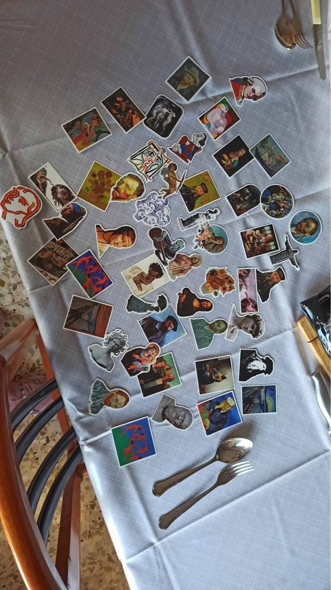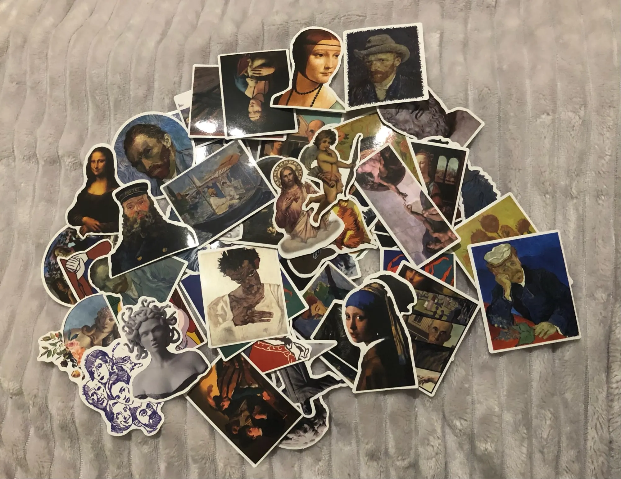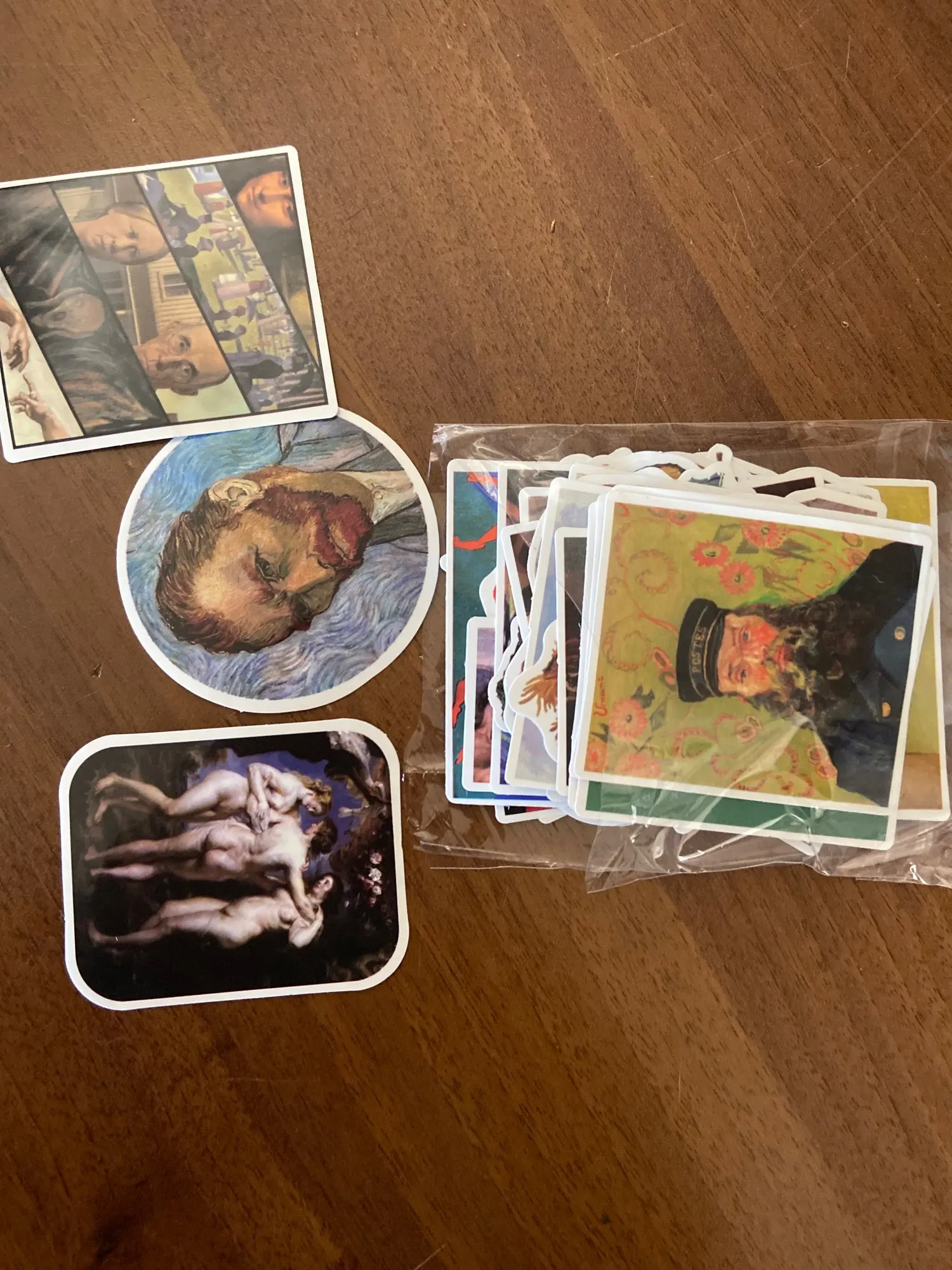 Наклейки с различными рисунками, от Ван Гога до Давида. Не идеальны, иногда цвета ошеломляются. Я ожидал большего.
