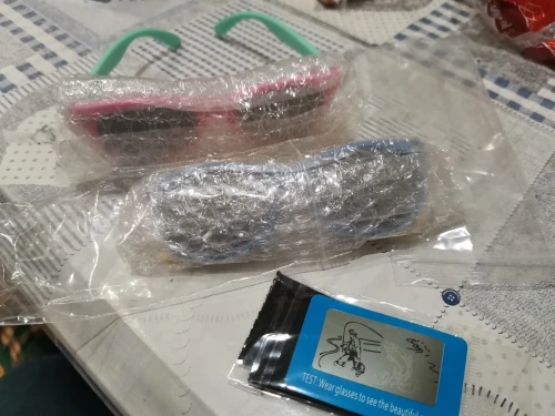 Очки шикарные, ребёнок в восторге. Попросила померить прям возле почты и не захотела снимать, хоть и было неудобно одевать с шапкой)))) В комплекте карточка-тестер и тряпочка для протирки. Упакованы хорошо, посылка пришла меньше чем за 3 недели